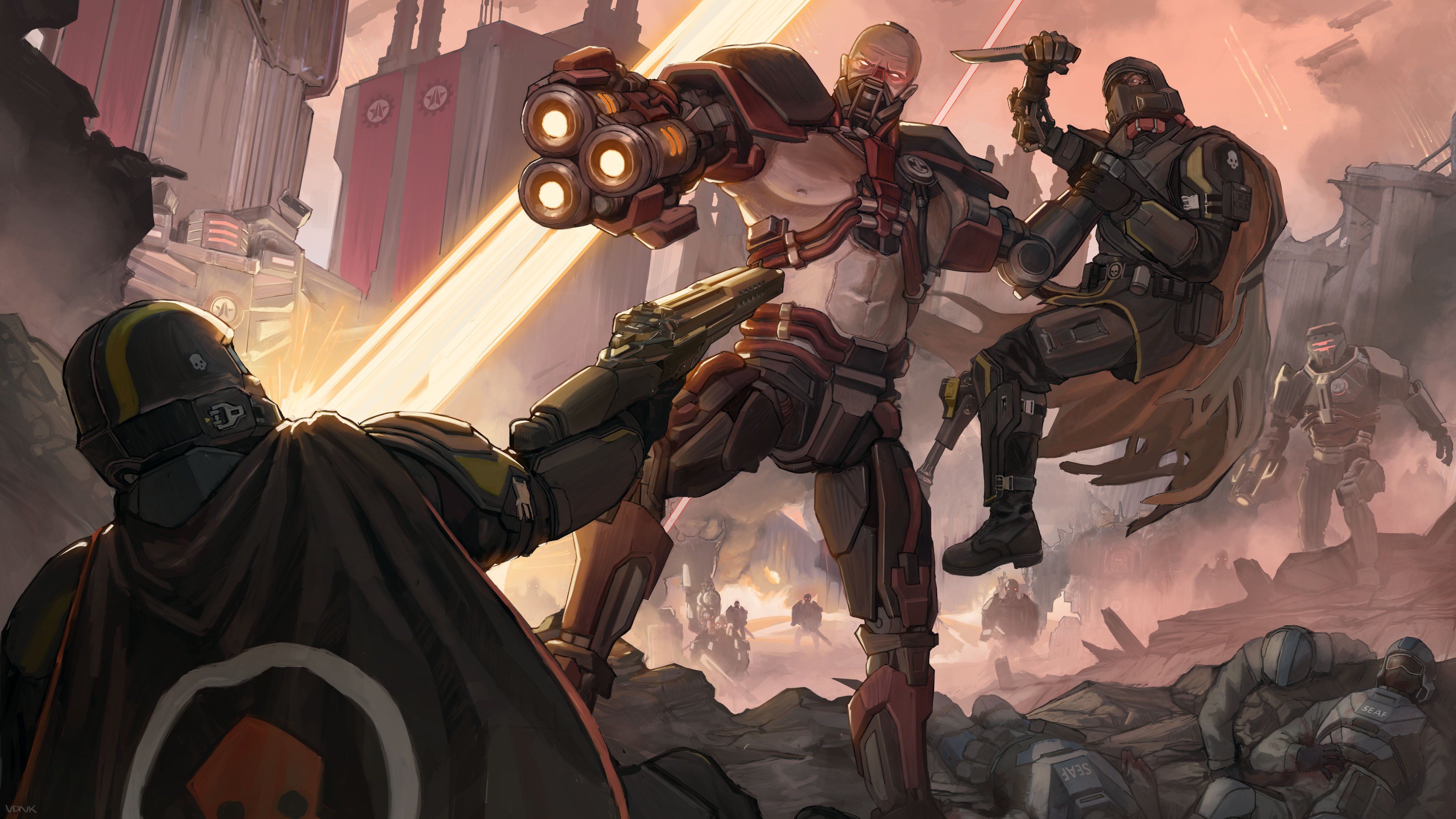 19vodnik 1other 2boys absurdres aiming arm_cannon armor automaton_(helldivers) blood blood_on_clothes boots building cape cityscape corpse cyborg_(helldivers) double-barreled_shotgun fire glowing glowing_eyes gun helldiver_(helldivers) helldivers_(series) highres holding holding_knife knife laser lifting_person mohawk multiple_boys neck_lift pauldrons prosthesis prosthetic_leg rifle seaf_soldier_(helldivers) shotgun shoulder_armor smoke spacecraft torn_cape torn_clothes vox_engine_(helldivers) war weapon