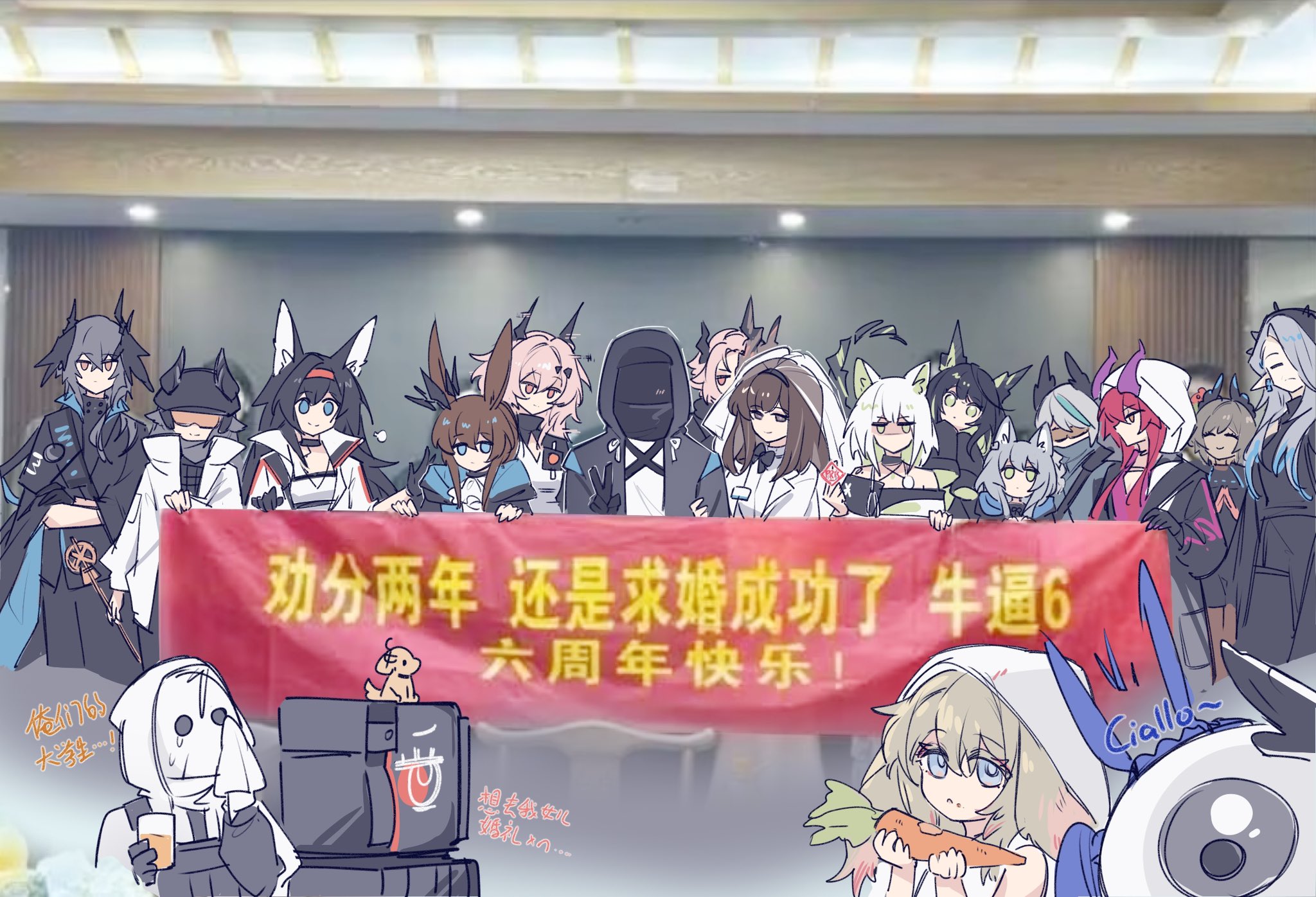 amiya_(arknights) animal_ears arknights ascalon_(arknights) banner black_gloves black_hair black_hat black_jacket blaze_(arknights) blue_eyes brown_hair cat_ears chinese_text doctor_(arknights) friston-3_(arknights) gloves goggles green_eyes grey_hair group_picture hat hierda_(arknights) highres holding holding_banner hood hood_up hooded_jacket horns jacket kal'tsit_(arknights) kaleka logos_(arknights) long_sleeves mantra_(arknights) mask mon3tr_(arknights) open_clothes open_jacket pink_eyes pink_hair pith_(arknights) priestess_(arknights) rabbit_ears raidian_(arknights) reunion_soldier_(arknights) rosmontis_(arknights) the_presence_(arknights) theresa_(arknights) theresis_(arknights) touch_(arknights) veil white_hair white_jacket yellow_eyes