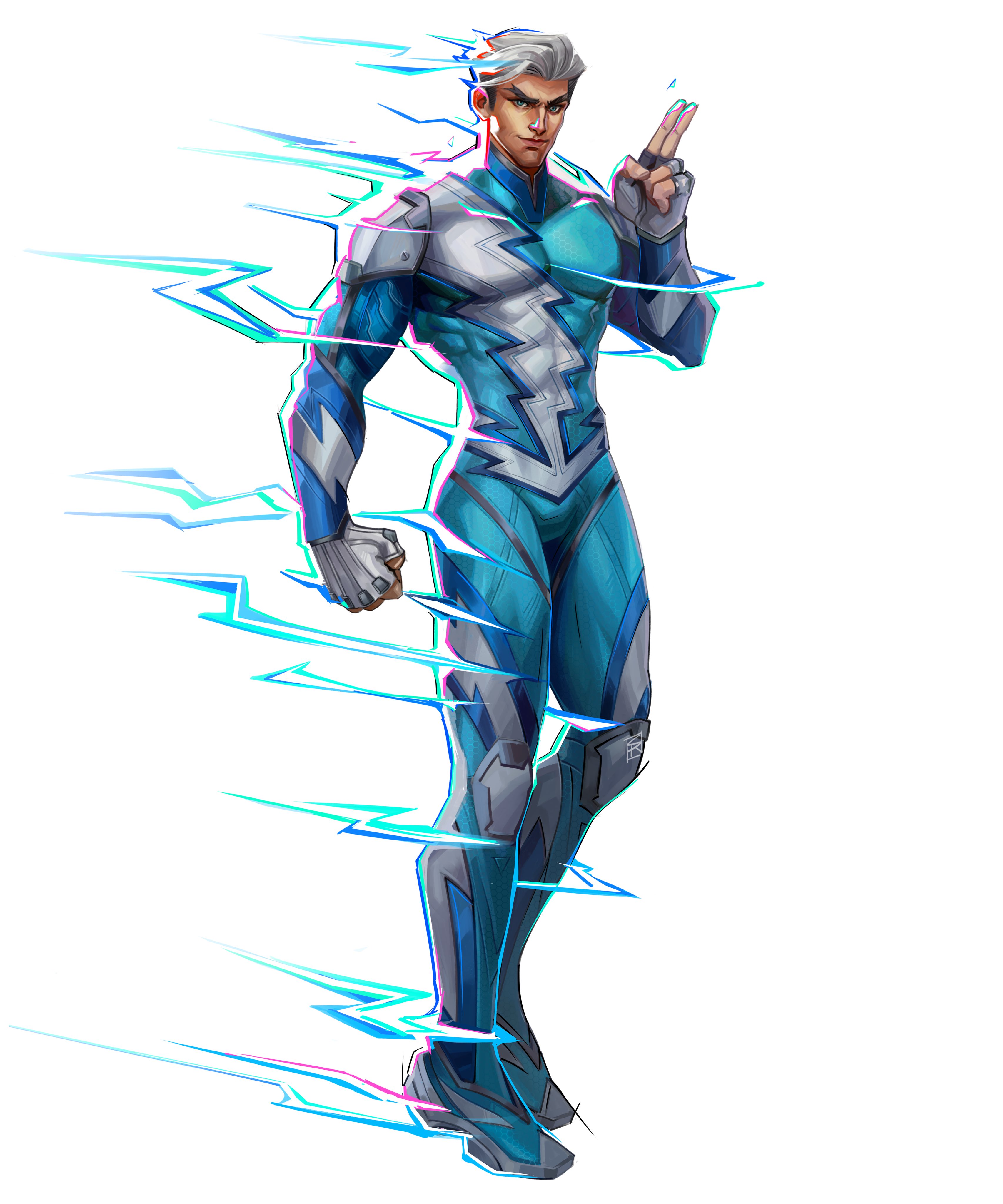 1boy absurdres blue_bodysuit blue_eyes bodysuit commentary covered_abs english_commentary fingerless_gloves full_body gloves hair_slicked_back highres knee_pads looking_at_viewer male_focus marvel marvel_rivals marvel_rivals_(style) multicolored_bodysuit muscular muscular_male obliques pietro_maximoff quicksilver_(marvel) salute shim0rin short_hair signature solo superhero_costume two-finger_salute white_background white_bodysuit white_hair x-men
