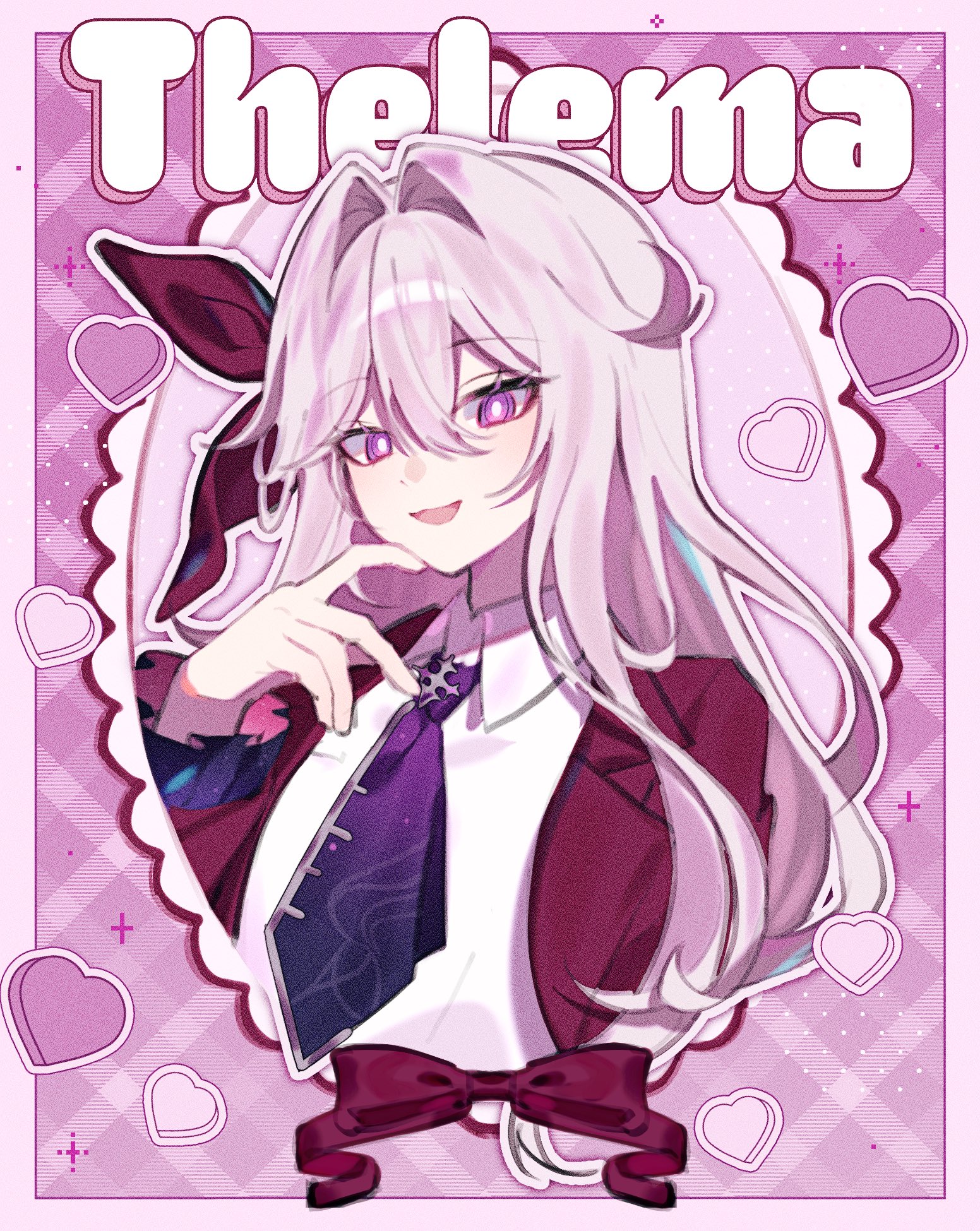 1girl border commentary hair_intakes heart highres honkai_(series) honkai_impact_3rd long_hair looking_at_viewer necktie official_alternate_costume pino_(pino2452) purple_background purple_eyes purple_necktie purple_vest shirt smile solo thelema_nutriscu untranslatable_commentary very_long_hair vest white_border white_hair white_shirt
