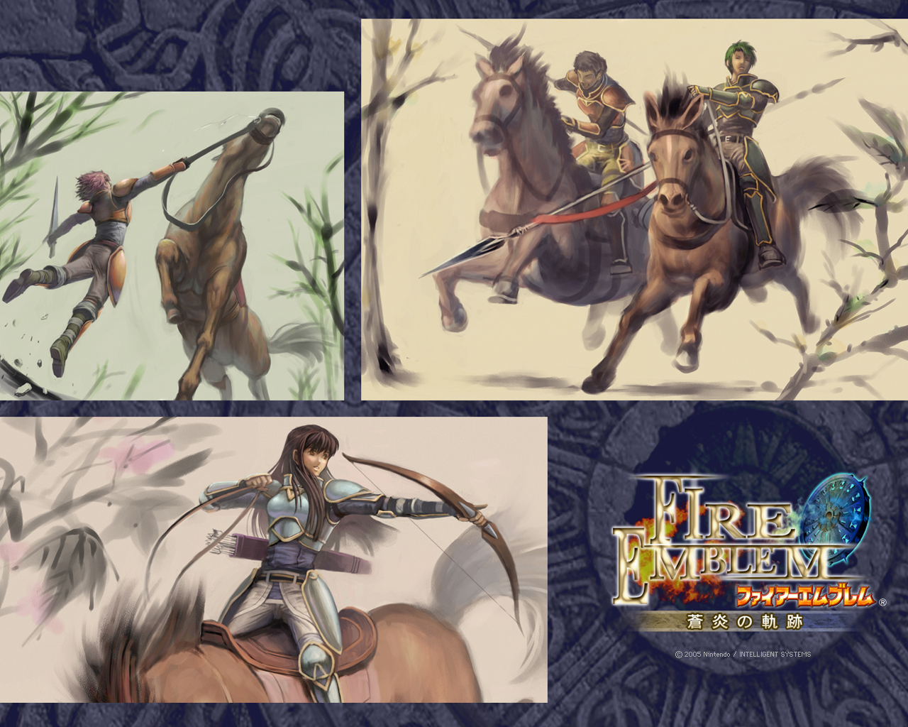 1girl 3boys armor artist_request astrid_(fire_emblem) bow_(weapon) company_name copyright_name fire_emblem fire_emblem:_path_of_radiance green_hair holding holding_bow_(weapon) holding_polearm holding_sword holding_weapon horse horseback_riding kieran_(fire_emblem) long_hair makalov_(fire_emblem) multiple_boys nintendo official_art official_wallpaper oscar_(fire_emblem) pink_hair polearm quiver riding short_hair sword weapon