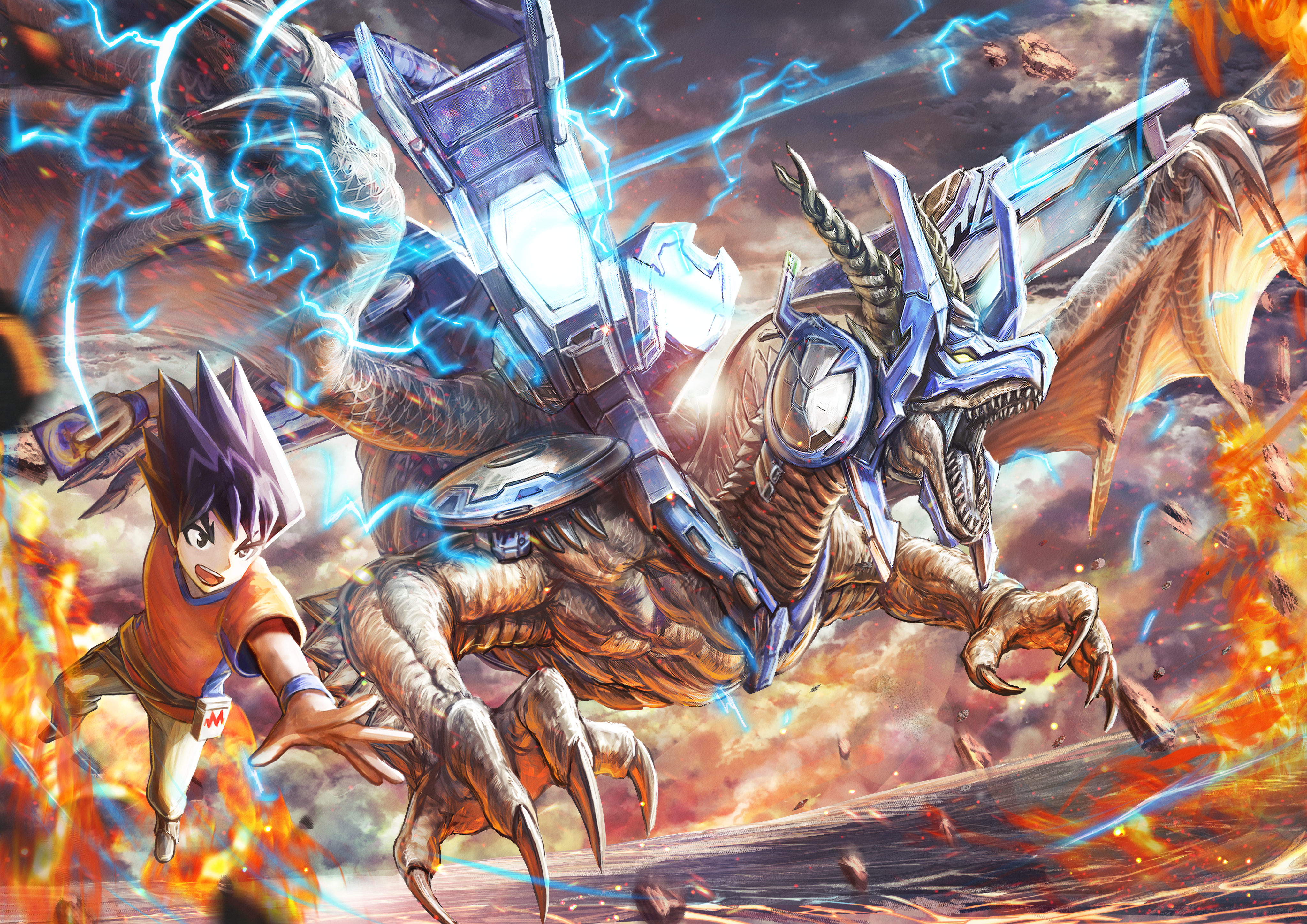 1boy absurdres armor black_eyes black_hair blue_armor blue_shirt bolmeteus_steel_dragon brown_pants card claws dragon dragon_claw dragon_horns dragon_wings duel_masters duel_masters_(classic) duel_masters_play's electricity fire giant giant_monster highres holding holding_card horns kirifuda_shoubu multicolored_shirt open_mouth orange_shirt pants robuja sharp_teeth shirt shoulder_cannon teeth trading_card western_dragon wings wristband yellow_eyes