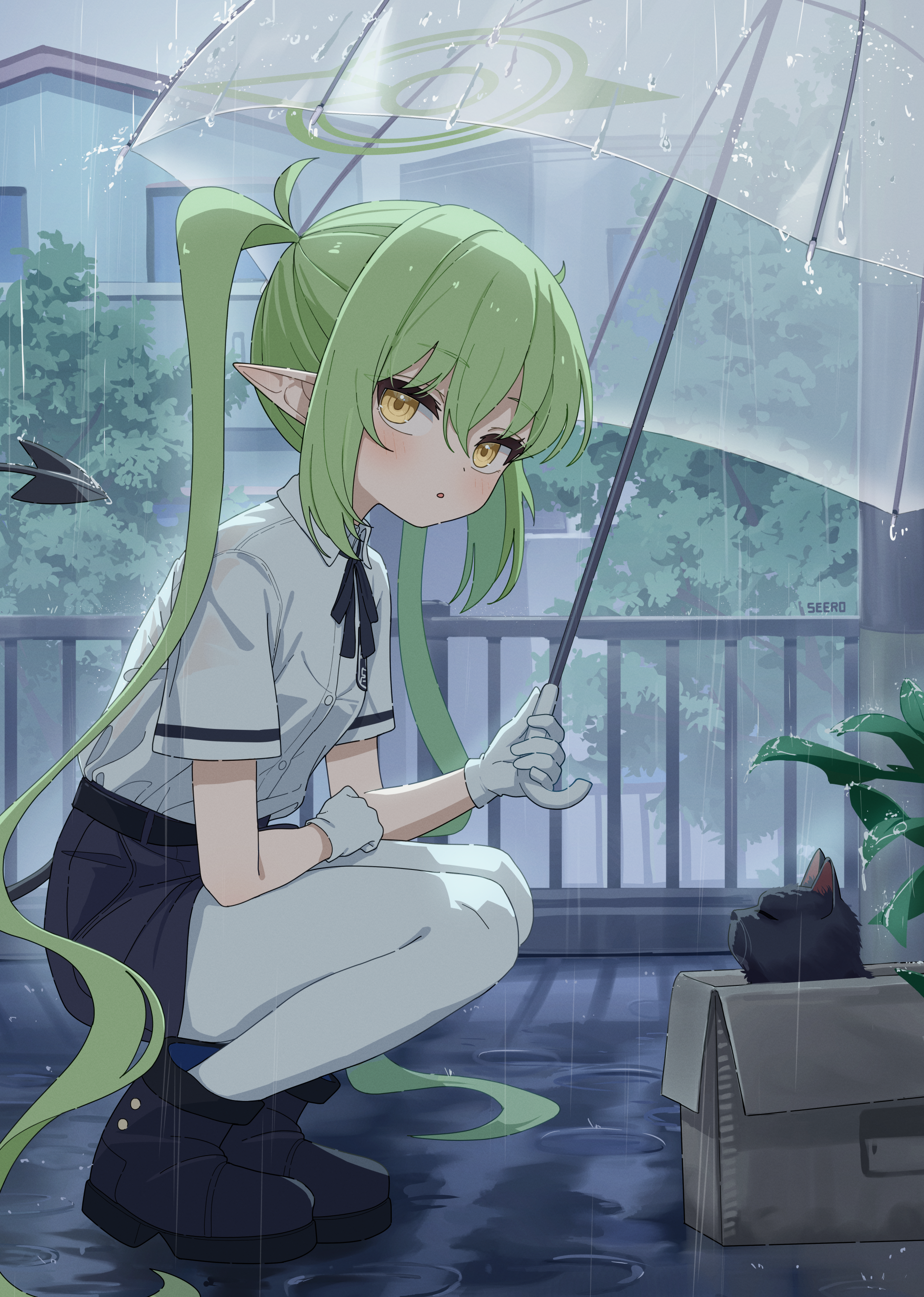 1girl absurdres artist_name black_boots black_cat black_shorts black_tail blue_archive boots box cardboard_box cat collared_shirt commentary demon_girl demon_tail from_side full_body gloves green_hair green_halo halo highres holding holding_umbrella long_hair looking_at_viewer nozomi_(blue_archive) open_mouth outdoors pantyhose pointy_ears rain seero shirt short_shorts shorts solo squatting tail transparent transparent_umbrella twintails umbrella very_long_hair white_gloves white_pantyhose white_shirt yellow_eyes