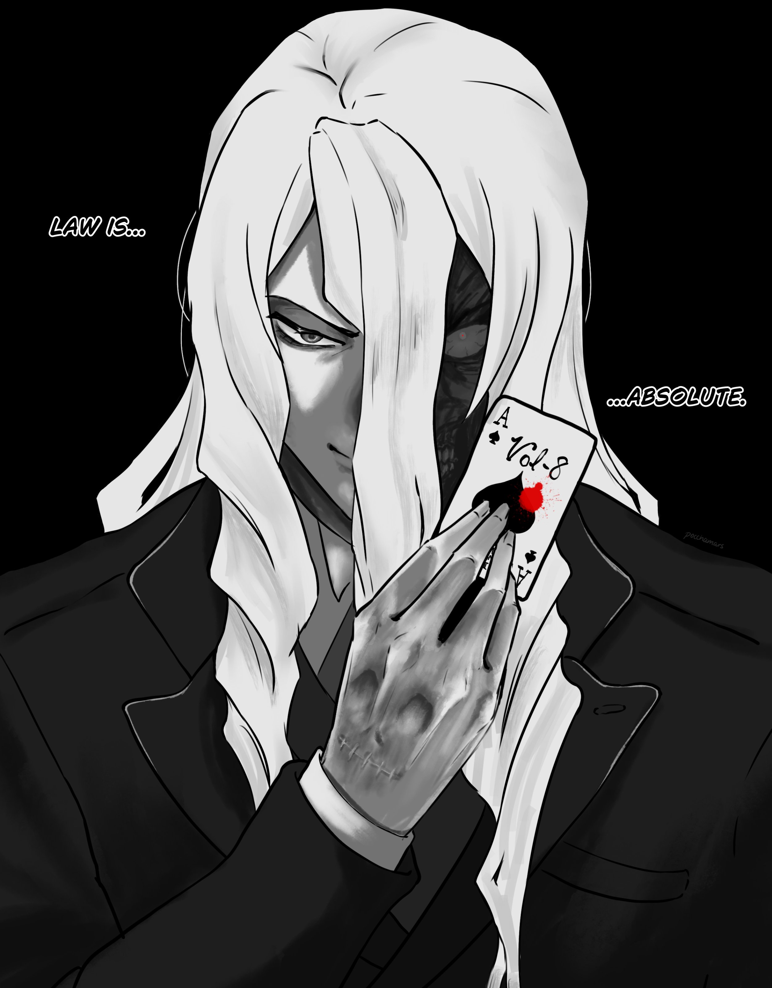 1boy absolute_batman absolute_dc absurdres ace_attorney apollo_justice:_ace_attorney batman_(series) contrast cosplay dc_comics english_text exposed_muscle highres jacket kristoph_gavin long_hair male_focus necktie pocchamars poker polar_opposites solo split_theme two-face two-face_(absolute_dc) two-face_(cosplay)