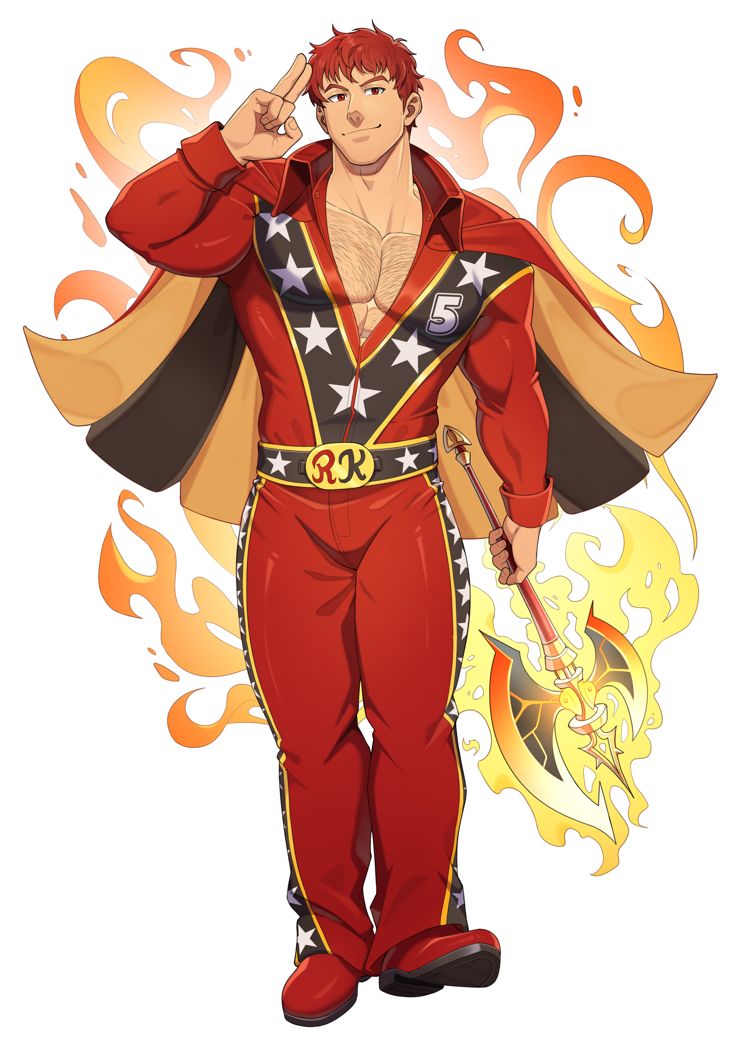 1boy absurdres alternate_costume axe bara cape chest_hair closed_mouth commentary english_commentary fire fire_emblem fire_emblem:_radiant_dawn flaming_weapon full_body geckobara highres holding holding_weapon kieran_(fire_emblem) looking_at_viewer male_focus muscular muscular_male nintendo pectoral_cleavage pectorals red_eyes red_hair salute short_hair simple_background solo two-finger_salute variant_set weapon white_background