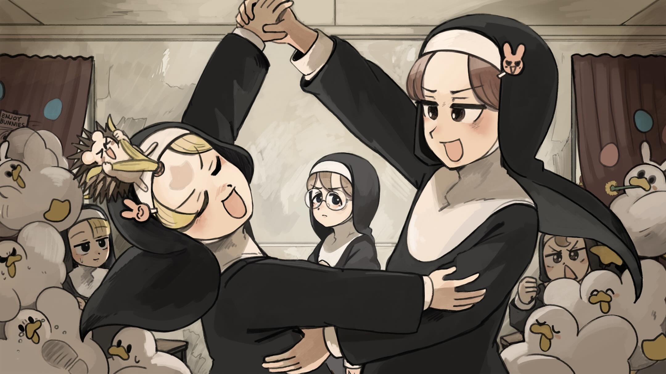 5girls :d animal_ears bird blonde_hair blue_eyes brown_eyes brown_hair chicken clumsy_nun_(diva) commentary dancing dandelion diva_(hyxpk) duck english_commentary flower froggy_nun_(diva) glasses glasses_nun_(diva) hair_ornament hedgehog highres hungry_nun_(diva) little_nuns_(diva) multiple_girls nun open_mouth rabbit_ears rabbit_hair_ornament round_eyewear smile spicy_nun_(diva) sweat traditional_nun triangle_mouth