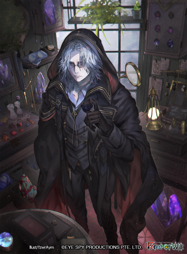 1boy artist_name black_hood black_pants book box cabinet commentary copyright_name crate floor force_of_will from_inside fuziwara_ayumu gem glasses gloves gold_trim grusbalesta_(force_of_will) holding holding_book holding_gem hooded_robe lamp leather leather_gloves looking_at_viewer magnifying_glass mirror official_art open_book open_mouth pants paper picture_frame plant polo_shirt robe shelf shoes single_glove solo table white_hair window wooden_table