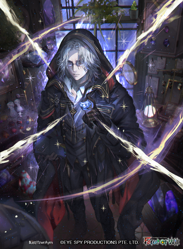 1boy artist_name black_hood black_pants book box cabinet commentary copyright_name crate floor force_of_will from_inside fuziwara_ayumu gem glasses gloves gold_trim grusbalesta_(force_of_will) holding holding_book holding_gem hooded_robe lamp leather leather_gloves looking_at_viewer magic magnifying_glass mirror official_art open_book open_mouth pants paper picture_frame plant polo_shirt robe shelf shoes single_glove solo sparkle star_(symbol) table white_hair window wooden_table