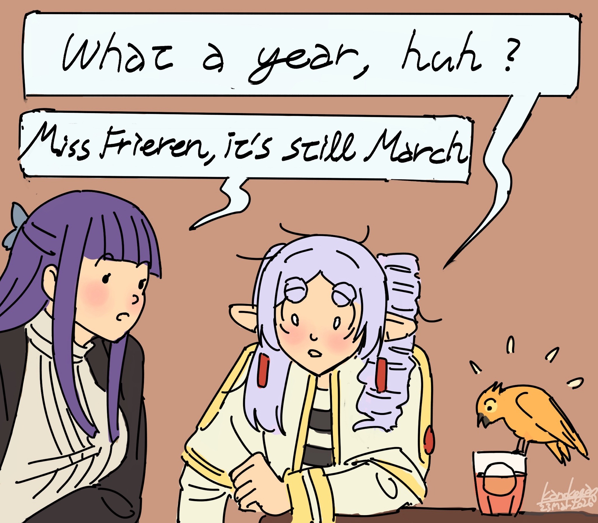 2girls arm_support artist_name bird black_coat blush capelet coat commentary dated dress drill_hair earrings elf english_commentary english_text fern_(sousou_no_frieren) frieren grey_hair herge_(style) highres jewelry kanokoga long_hair long_pointy_ears meme multiple_girls open_clothes open_coat parody parted_bangs parted_lips pointy_ears purple_hair signature single_drill sitting sousou_no_frieren speech_bubble table thick_eyebrows tintin twintails what_a_week_huh_(meme) white_capelet white_dress