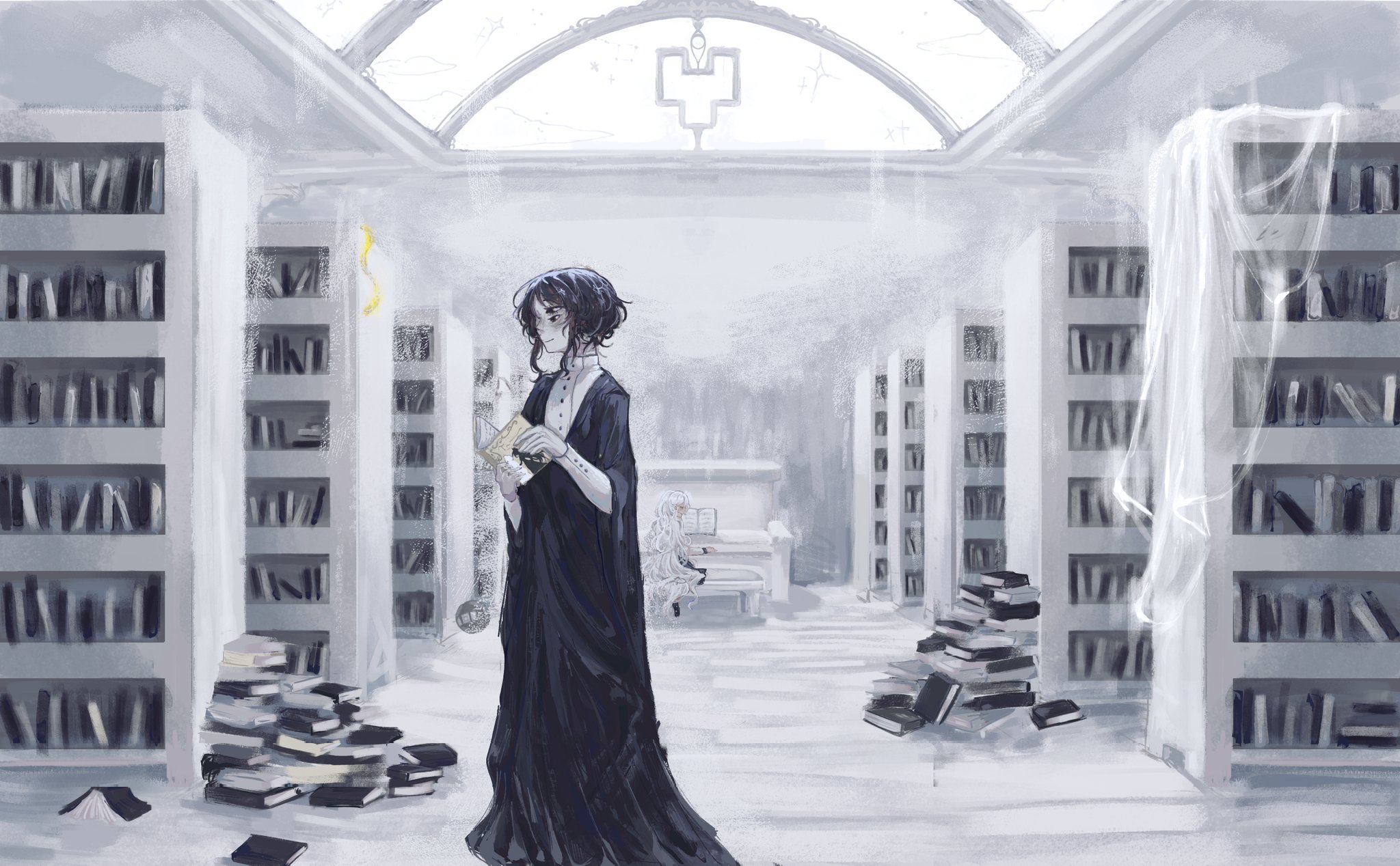 1boy 1girl arch black_hair black_robe black_sclera book book_stack bookshelf buttoned_cuffs buttons charlotte_wiltshire colored_sclera curtains extra_eyes four_eyes frei_(hello_charlotte) grand_piano heart hello_charlotte highres holding holding_book instrument library light_smile long_hair mi_hao painterly piano piano_bench pile_of_books ribbon robe see-through_curtains shirt short_hair sidelocks sitting sparkle turtleneck turtleneck_shirt very_long_hair white_background white_hair white_shirt yellow_ribbon