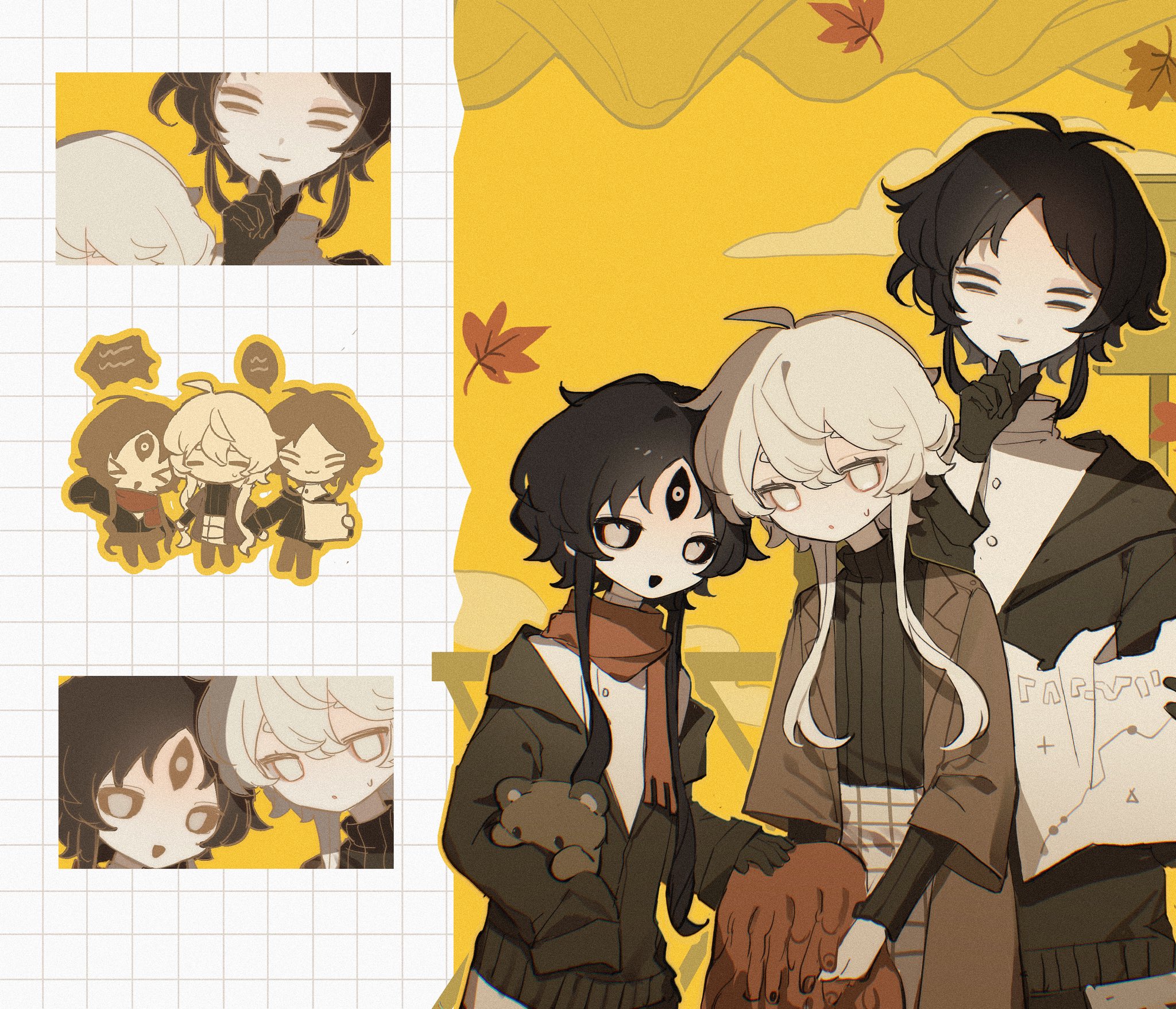 >_< 1boy 2girls :3 autumn autumn_leaves black_gloves black_hair black_jacket black_sclera black_sweater brown_jacket buttons charlotte_wiltshire checkered_background checkered_clothes checkered_skirt chibi closed_eyes cloud colored_sclera commentary_request extra_eyes four_eyes frei_(hello_charlotte) freya_(hello_charlotte) gloves hand_on_own_chin hello_charlotte highres holding holding_map jacket leaf light_smile long_sidelocks map multiple_girls multiple_views parted_lips red_scarf scarf shirt short_hair short_hair_with_long_locks sidelocks skirt smile sweat sweatdrop sweater triclops turtleneck turtleneck_shirt turtleneck_sweater u5cbs white_eyes white_hair white_shirt white_skirt yellow_background