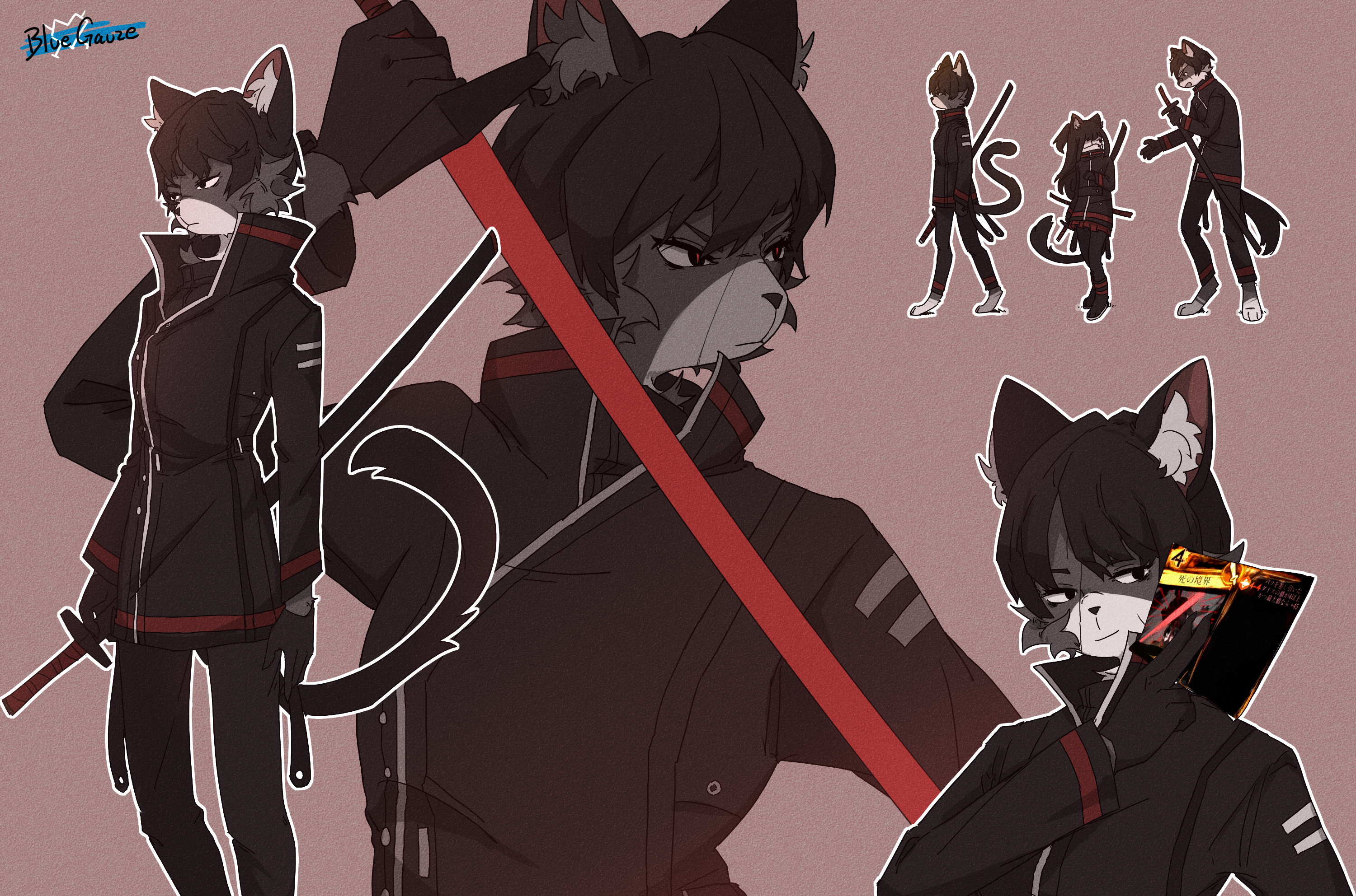 1boy 2girls black_eyes black_gloves black_hair black_jacket black_pants bluegauze card cat_girl commentary_request full_body furrification furry gameplay_mechanics gloves hand_up highres holding holding_card holding_sword holding_weapon jacket library_of_ruina long_sleeves multiple_girls pants project_moon red_pupils shi_association_south_uniform short_hair sword tenma_(project_moon) valentin_(project_moon) weapon yujin_(project_moon)