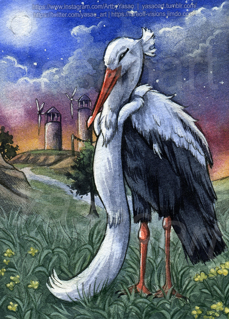 animal_focus bird bombirdier cloud commentary english_commentary flower full_body full_moon grass instagram_username moon night nintendo no_humans outdoors painting_(medium) pokemon pokemon_(creature) pokemon_focus solo star_(sky) traditional_media tree tumblr_username twitter_username watermark web_address windmill yasaoart