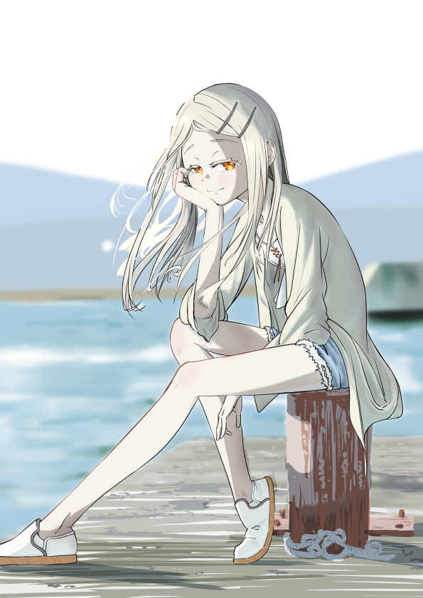 1girl blonde_hair blurry camisole coat commentary_request depth_of_field gakuen_idolmaster head_rest idolmaster key_chan long_hair looking_at_viewer ocean orange_eyes outdoors pier shinosawa_hiro sitting sky smile solo water