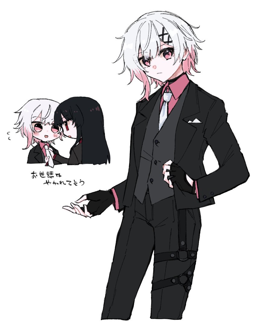 2girls alternate_costume black_gloves black_jacket black_pants black_suit black_vest chibi chibi_inset commentary_request formal_clothes gloves hair_ornament jacket long_sleeves looking_at_viewer mahou_shoujo_no_majo_saiban multicolored_hair multiple_girls necktie nikaido_hiro o-ring o-ring_thigh_strap pants pink_eyes pink_hair pink_shirt sakuraba_ema shirt short_hair solo_focus standing suit thigh_strap translation_request vest white_hair white_necktie x_hair_ornament yume_mogura