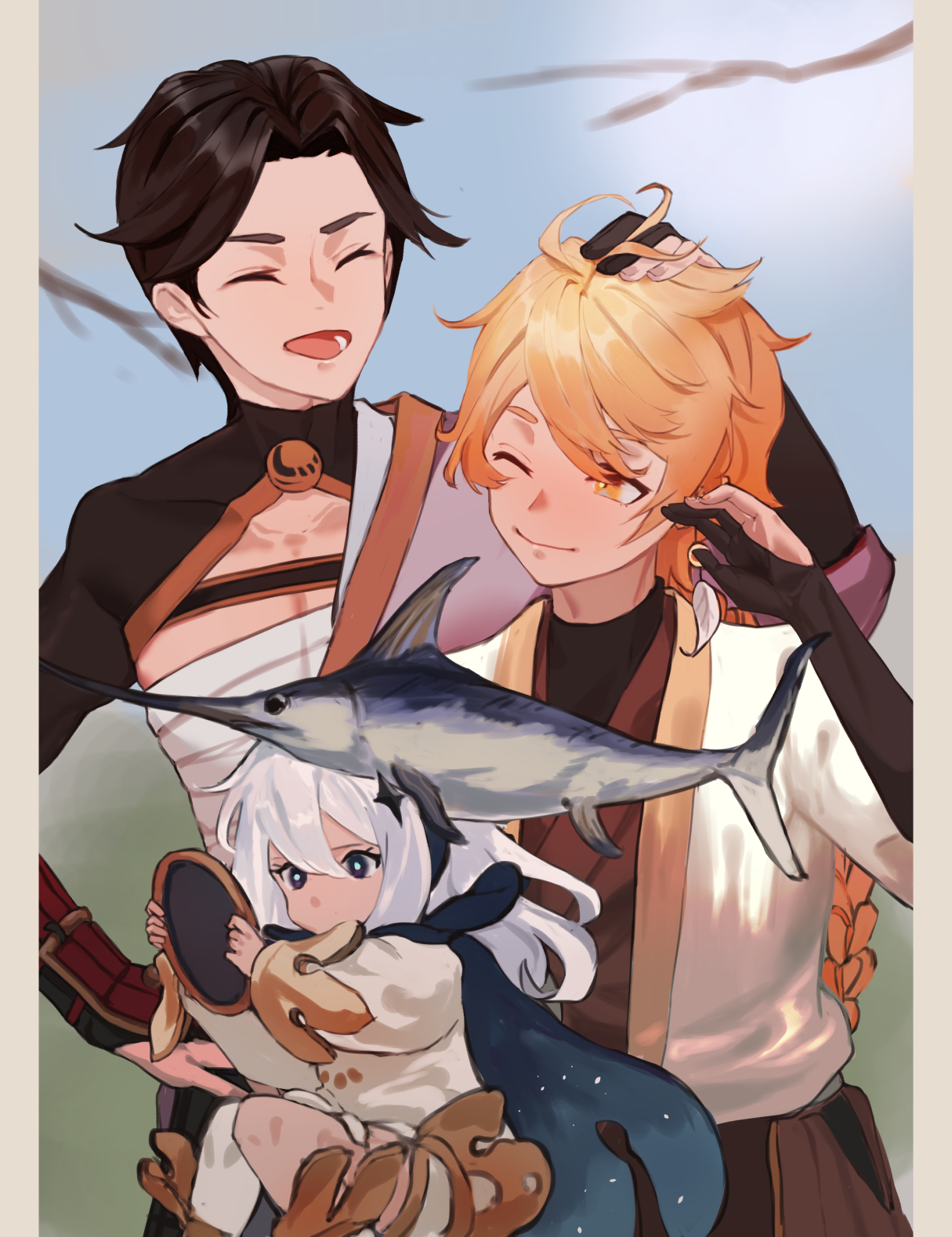 1girl 2boys aether_(genshin_impact) ahoge alternate_costume blonde_hair blue_eyes blue_sky blurry blurry_background branch bridal_gauntlets brown_hair chest_sarashi closed_eyes closed_mouth collarbone commentary depth_of_field earrings floating genshin_impact hair_between_eyes happy head_tilt highres japanese_clothes jewelry kizuku_vii light_smile looking_to_the_side looking_up multiple_boys one_eye_closed open_mouth orange_eyes paimon_(genshin_impact) pectoral_cleavage pectorals sarashi single_earring sky standing teppei_(genshin_impact) upper_body white_hair