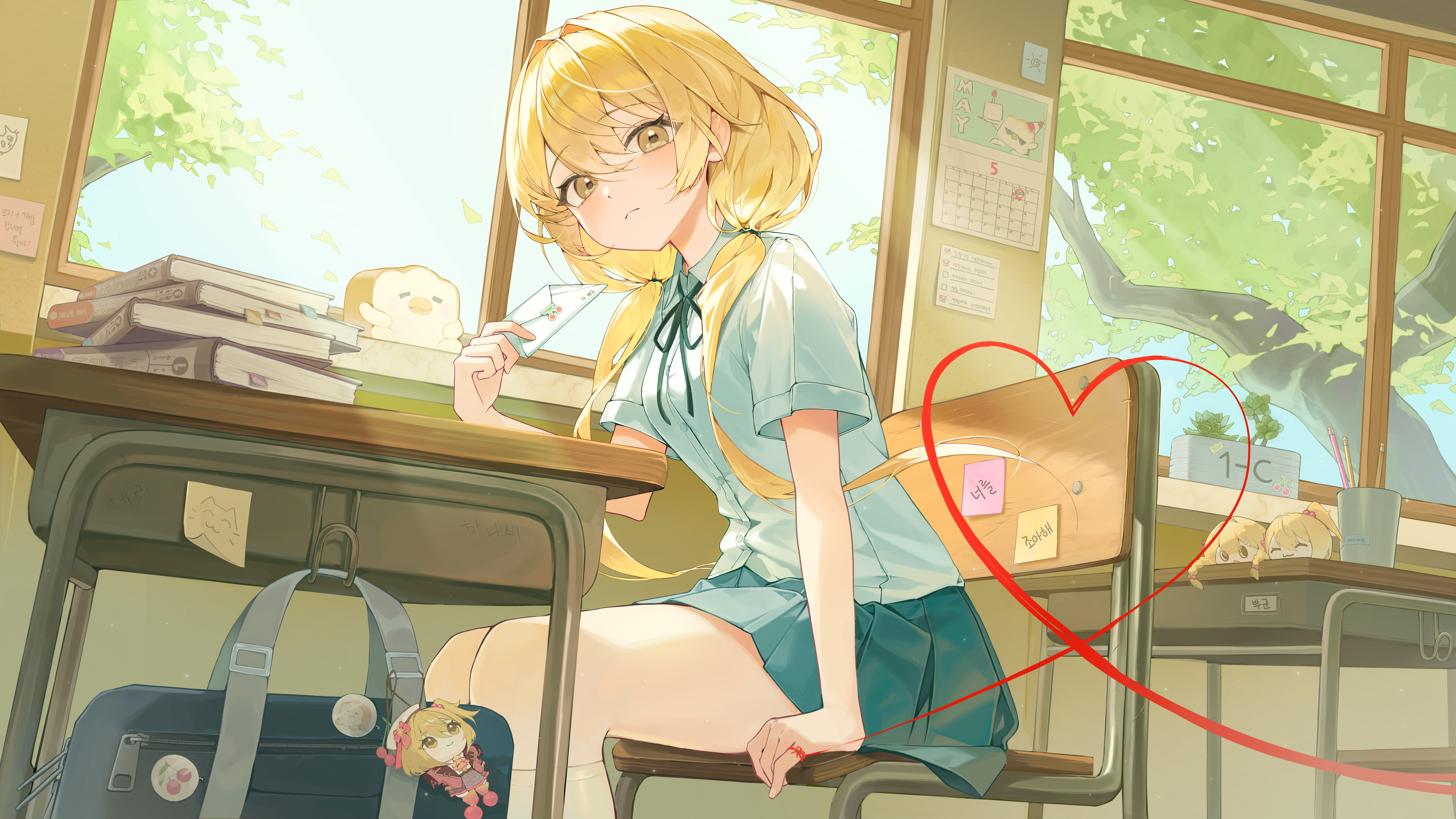 1girl absurdres asahina_cherii bag bag_charm black_ribbon blonde_hair blue_skirt book bread breasts calendar_(object) chair charm_(object) collared_shirt commentary cup desk envelope food h0kori hair_between_eyes hanavi highres holding holding_envelope kneehighs korean_text long_hair looking_at_viewer low_twintails medium_breasts neck_ribbon pencil pleated_skirt red_ribbon ribbon school_bag school_chair school_desk shirt sitting skirt sky socks solo sticky_note textbook thighhighs tree twintails untranslatable_commentary virtual_youtuber white_shirt white_socks window yellow_eyes