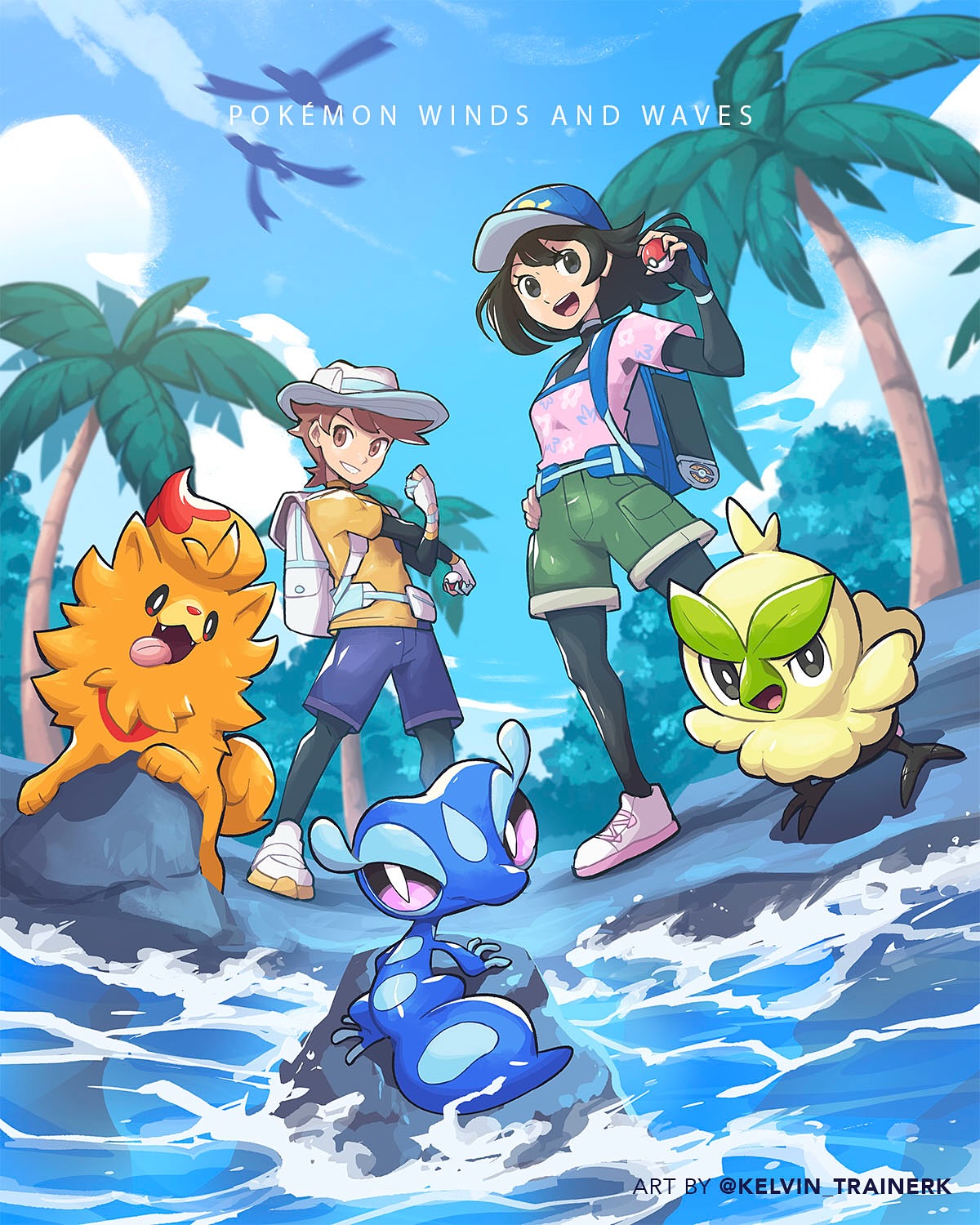 1boy 1girl artist_name baby_animal bird browt chick female_protagonist_(pokemon_ww) gecko gecqua gen_10_pokemon highres holding holding_poke_ball kelvin-trainerk male_protagonist_(pokemon_ww) nintendo palm_tree poke_ball pokemon pokemon_winds_and_waves pombon pomeranian_(dog) rock starter_pokemon_trio tree water waves