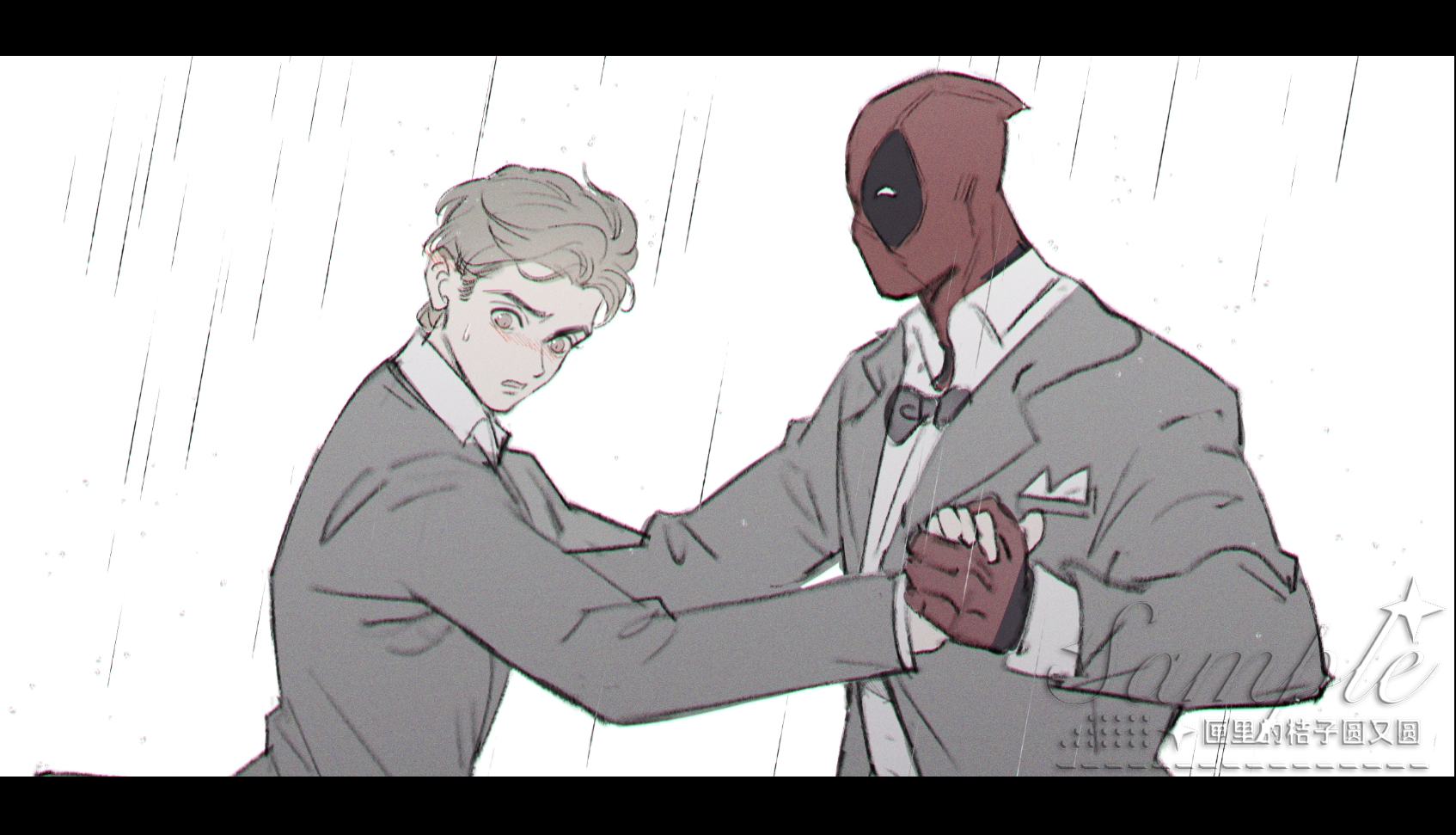2boys black_border black_bow black_bowtie black_jacket bodysuit border bow bowtie breast_pocket brown_eyes brown_hair chinese_commentary collared_shirt commentary_request dancing danmo222 deadpool deadpool_(series) formal_clothes from_side hands_up highres holding_hands jacket lapels long_sleeves looking_down male_focus marvel multiple_boys open_clothes open_jacket peter_parker pocket pocket_square rain red_bodysuit red_mask sample_watermark shirt short_hair simple_background sketch spider-man_(series) standing suit suit_jacket superhero_costume sweatdrop teeth upper_body watermark white_background white_shirt yaoi