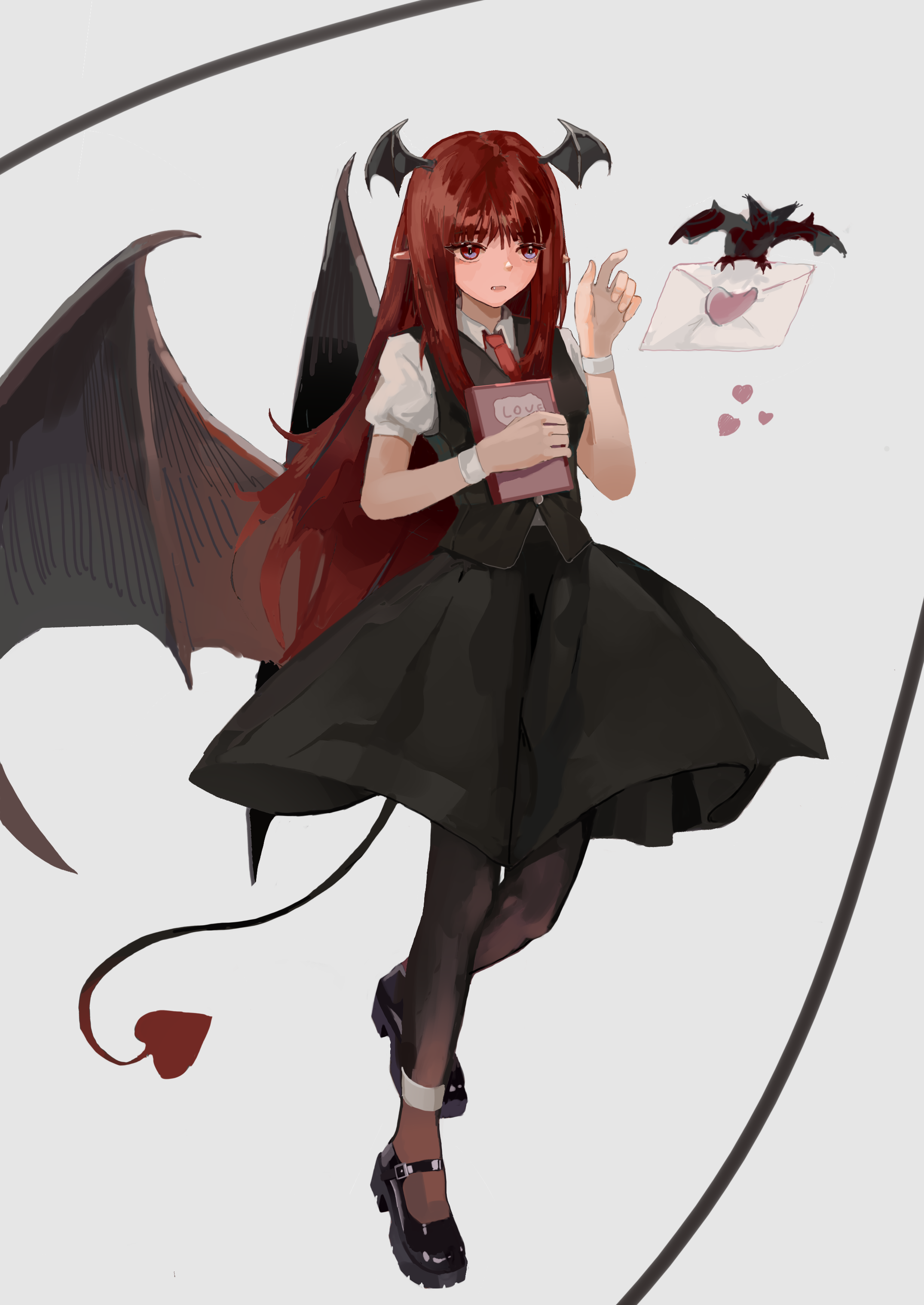 1girl absurdres bat_(animal) bat_wings black_pantyhose black_shoes black_skirt black_vest book collared_shirt commentary_request demon_tail envelope full_body hand_up head_wings heart highres holding holding_book koakuma long_hair looking_at_animal mary_janes necktie pantyhose puffy_short_sleeves puffy_sleeves red_eyes red_hair red_necktie shirt shoes short_sleeves simple_background skirt skirt_set solo suwell tail touhou vest white_background white_shirt wings