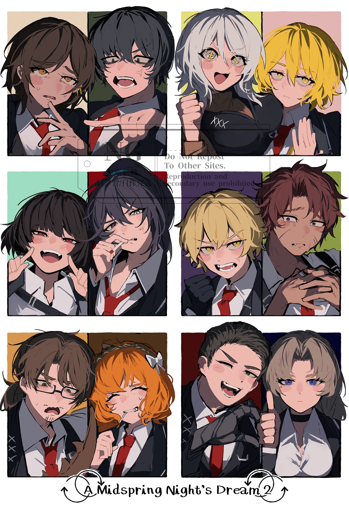 6+boys 6+girls ^_^ black_coat black_hair black_vest blonde_hair blue_eyes body_switch brown_eyes brown_hair brown_hairband closed_eyes coat collared_shirt commentary_request dark-skinned_female dark-skinned_male dark_skin don_quixote_(project_moon) faust_(project_moon) glasses gregor_(project_moon) hairband heart_hands_failure heathcliff_(project_moon) highres hong_lu_(project_moon) ishmael_(project_moon) lapels limbus_company long_hair low_ponytail meursault_(project_moon) multiple_boys multiple_girls nakame77 necktie notched_lapels open_mouth orange_hair outis_(project_moon) personality_switch pointing ponytail project_moon red_necktie rodion_(project_moon) rope ryoshu_(project_moon) shirt short_hair sidelocks sinclair_(project_moon) smile very_long_hair vest white_hair white_shirt white_trim yellow_eyes yi_sang_(project_moon)
