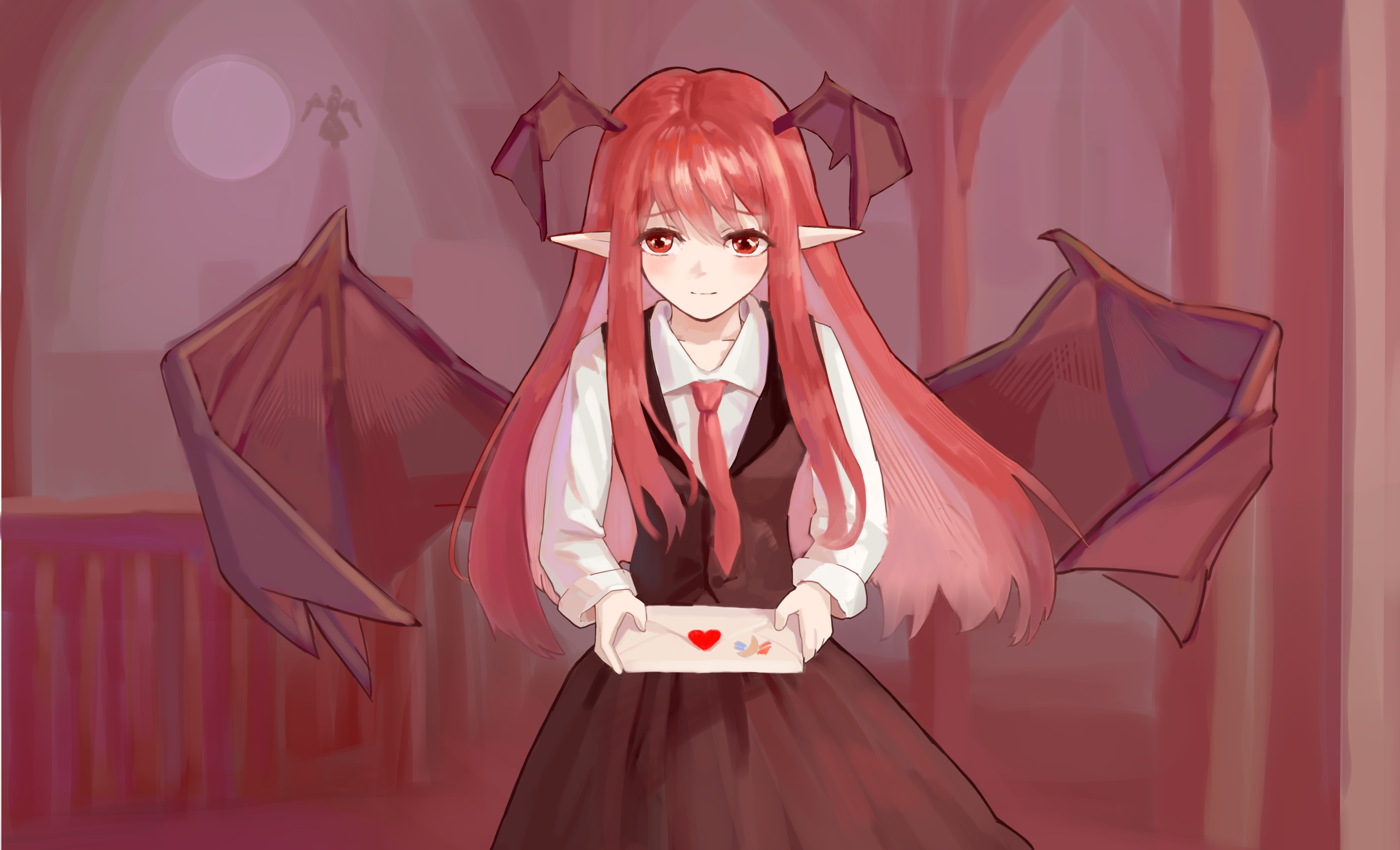 1girl absurdres bat_wings black_skirt black_vest closed_mouth collared_shirt commentary_request cowboy_shot demon_girl envelope head_wings highres holding holding_envelope indoors koakuma light_smile long_hair long_sleeves looking_at_viewer necktie pointy_ears red_eyes red_hair red_necktie shirt skirt skirt_set sleeves_rolled_up solo standing suwell touhou vest white_shirt wings