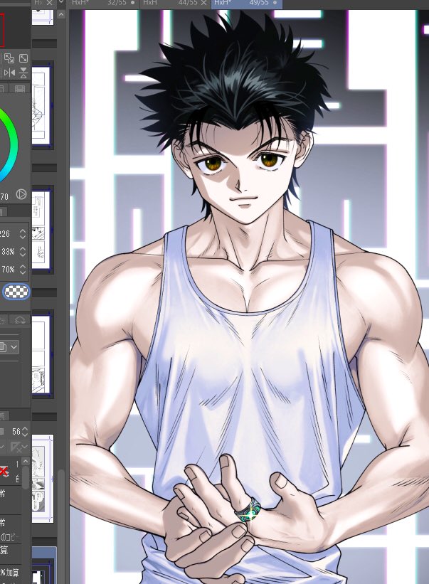 1boy art_program_in_frame black_hair brown_eyes commentary ging_freecss hunter_x_hunter jewelry male_focus messy_hair muscular muscular_male ring sketch solo spiked_hair sub5cr untranslatable_commentary