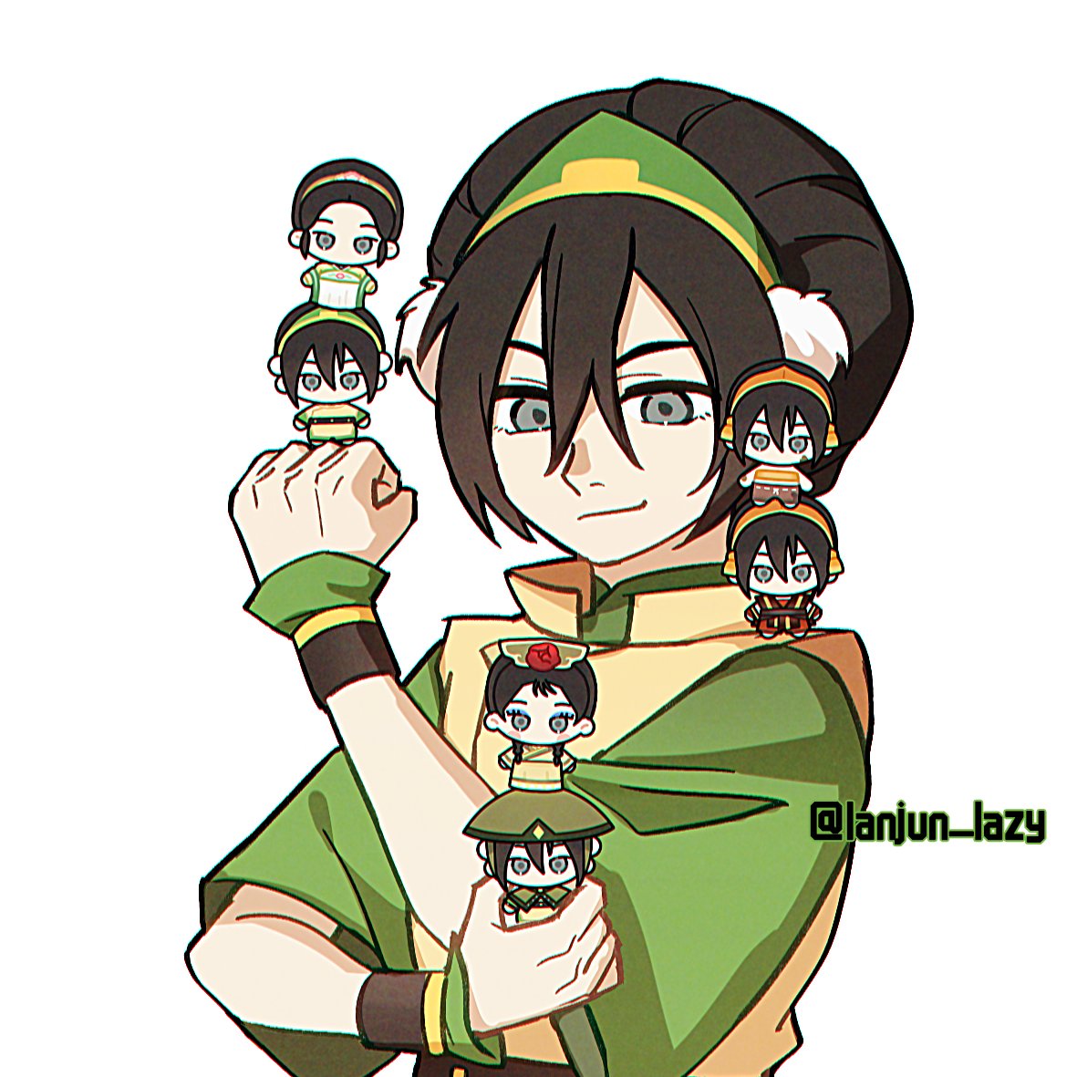 1girl artist_name avatar:_the_last_airbender avatar_legends black_hair blind chibi commentary green_hairband hair_bun hairband lanjun_lazy signature single_hair_bun smile toph_beifong twitter_username