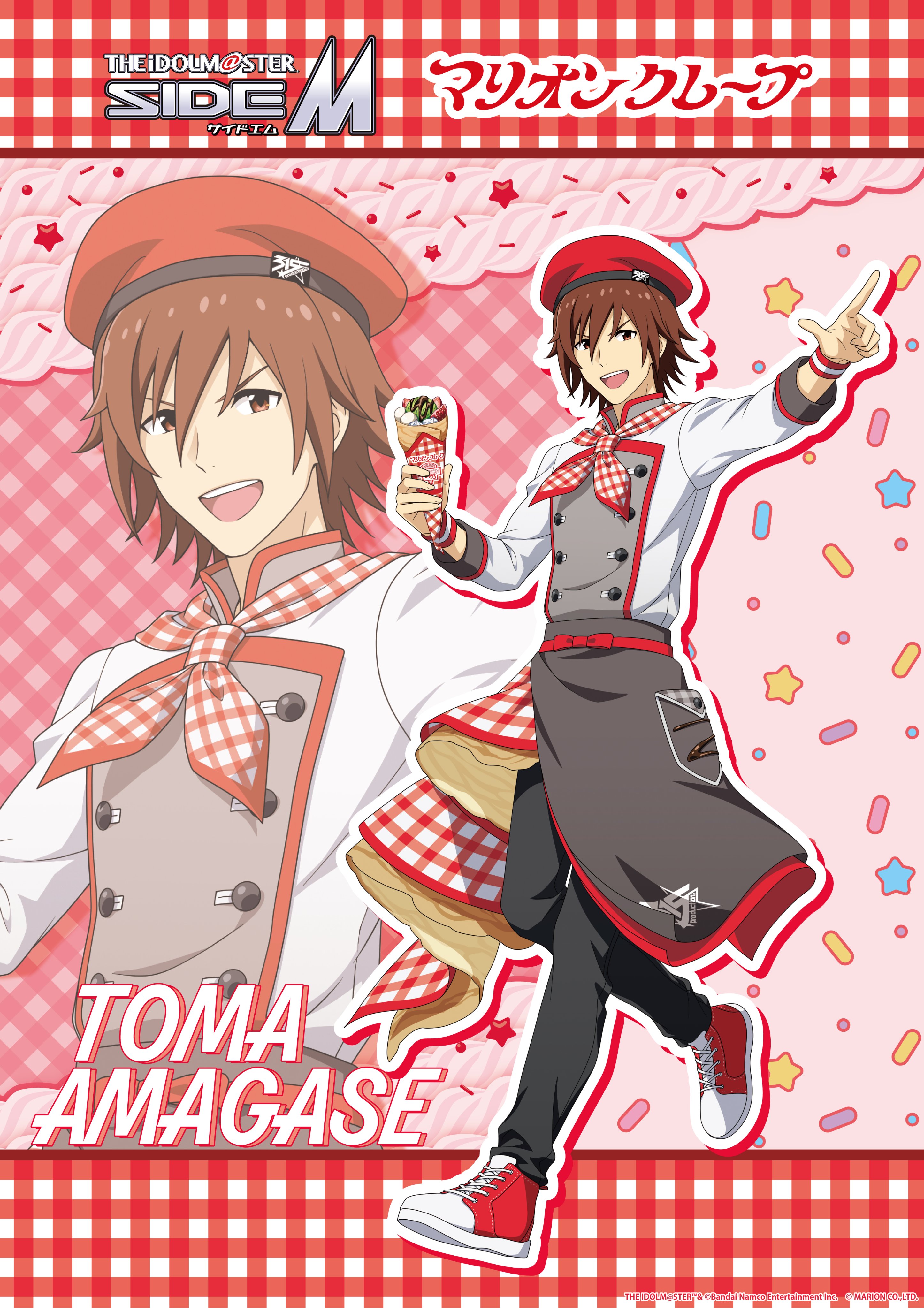1boy absurdres amagase_touma apron beret black_pants brown_eyes brown_hair character_name commentary_request crepe food hat highres holding holding_food idolmaster idolmaster_side-m logo looking_at_viewer male_focus official_alternate_costume official_art open_mouth pants pointing pointing_up shirt short_hair smile solo white_shirt