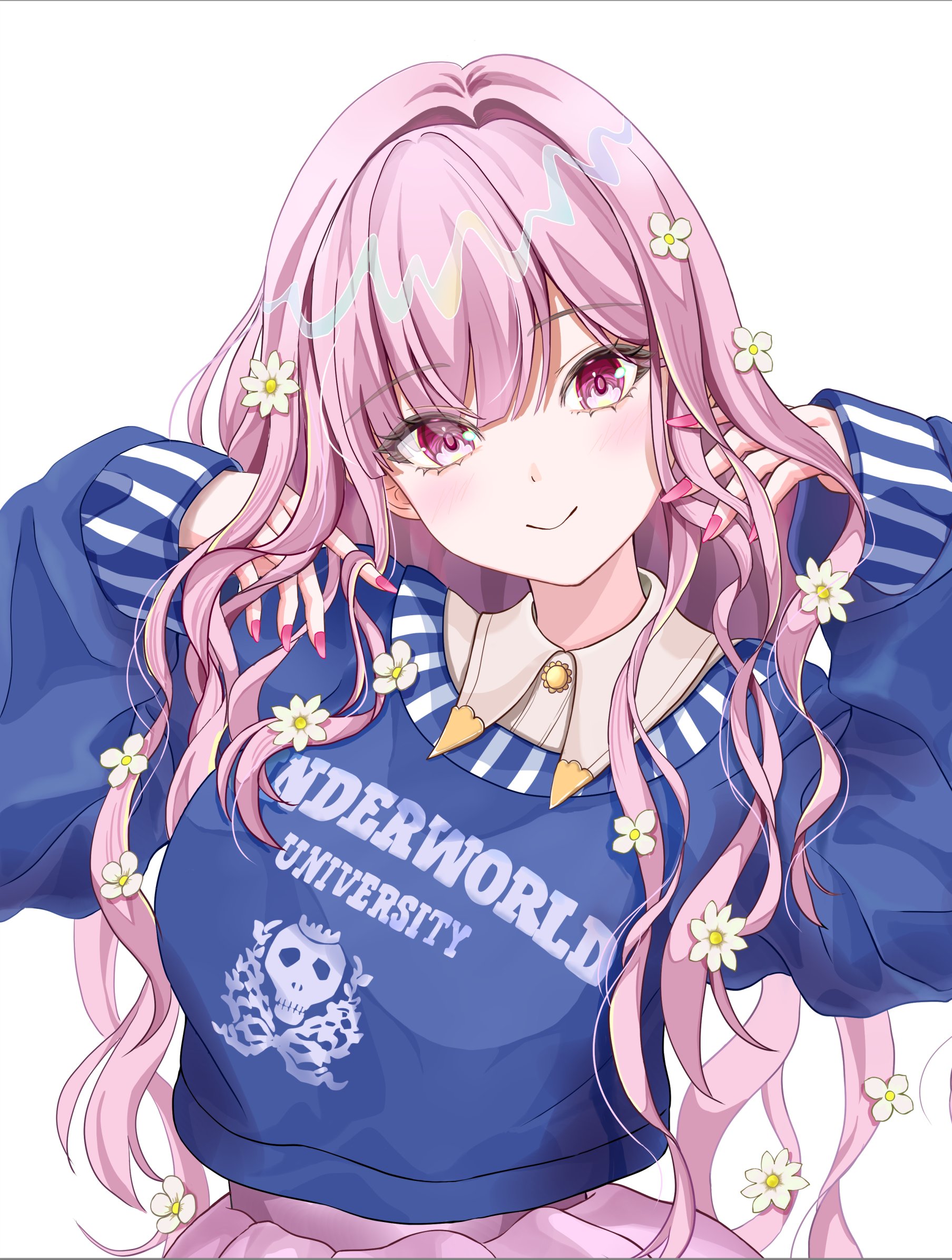 blue_sweater blush closed_mouth clothes_writing collared_shirt commentary eyelashes fingernails flower hair_flower hair_ornament hands_in_own_hair highres hololive hololive_english long_hair long_sleeves mori_calliope mori_calliope_(kawaiiope) nail_polish official_alternate_costume pink_eyes pink_hair pink_nails shino_(shinderera) shirt simple_background smile sweater upper_body virtual_youtuber white_background white_shirt
