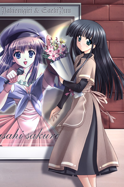 1girl bad_id black_hair black_shirt black_skirt blue_eyes blunt_bangs bouquet brown_dress character_name character_request check_character closed_mouth comic_party dress feet_out_of_frame flower holding holding_bouquet idol layered_sleeves long_hair long_sidelocks long_sleeves looking_at_viewer looking_to_the_side music outdoors pink_flower poster_(object) saeki_yuu sakurai_asahi shirt short_over_long_sleeves short_sleeves sidelocks singing skirt solo standing