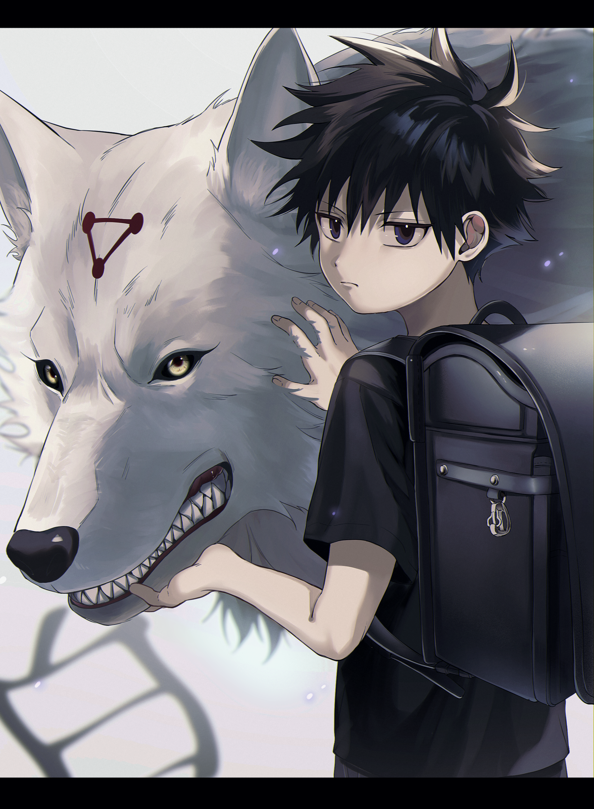 1boy absurdres aged_down animal backpack bag black_bag black_border black_hair black_shirt border child closed_mouth commentary_request fushiguro_megumi gyokuken highres jujutsu_kaisen letterboxed looking_at_viewer male_focus shirt short_hair solo standing tune_oekk wolf