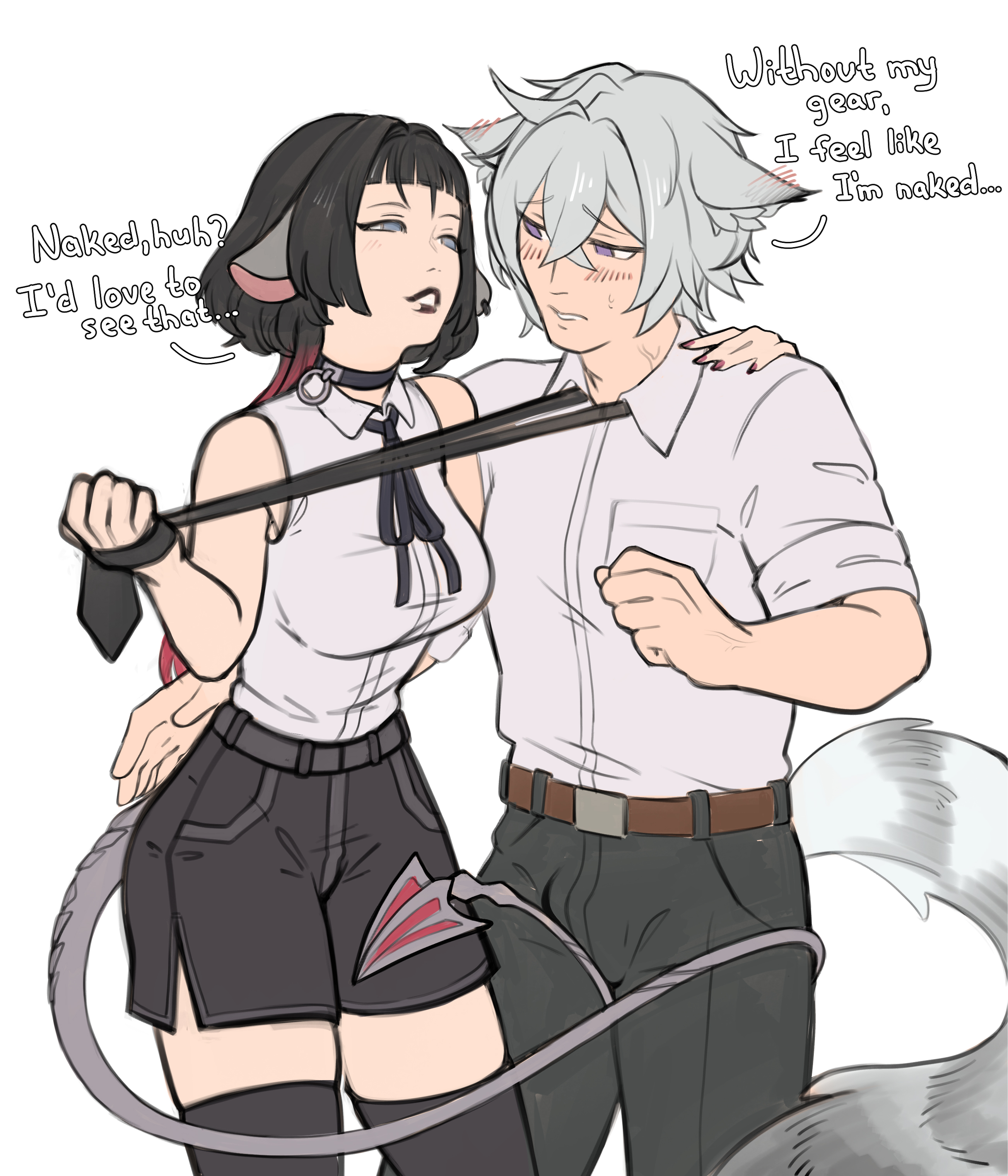 absurdres animal_ears artist_request black_hair cat_boy cat_ears chainsaw_man cosplay costume_switch couple denji_(chainsaw_man) english_text highres jane_doe_(zenless_zone_zero) mouse_(animal) necktie purple_eyes reze_(chainsaw_man) reze_(chainsaw_man)_(cosplay) seth_lowell socks tail white_hair zenless_zone_zero