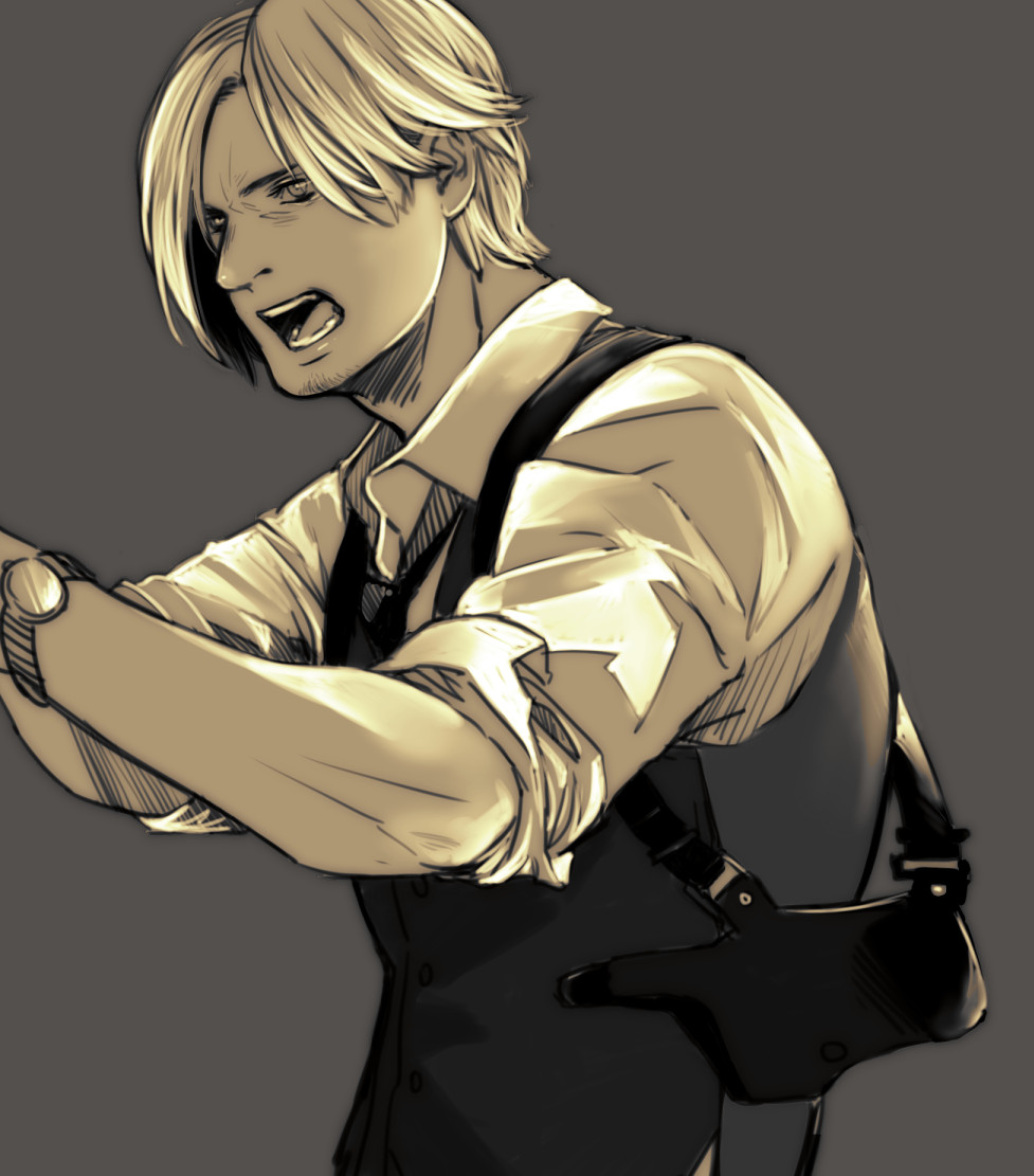 1boy backlighting bag collared_shirt commentary_request copyright_request furrowed_brow leon_s._kennedy looking_to_the_side male_focus ncle_69 open_mouth out_of_frame resident_evil serious shirt short_hair shoulder_bag sleeves_rolled_up solo vest watch wristwatch