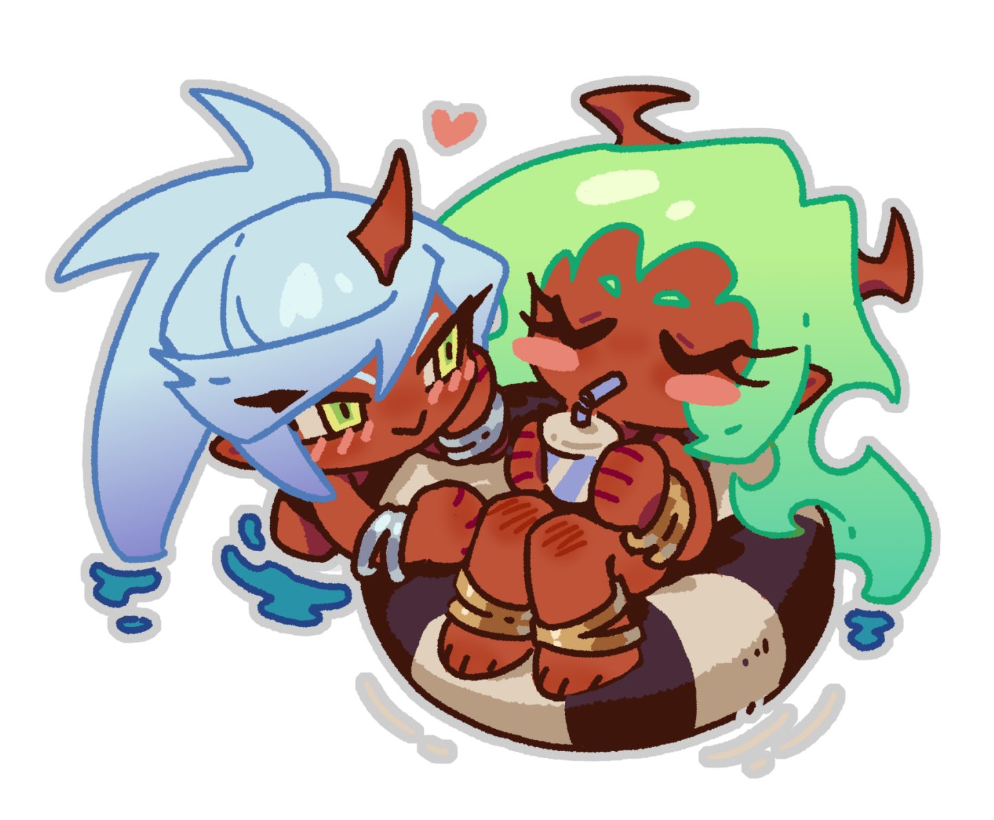 2girls blue_hair colored_skin commentary demon_girl demon_horns green_eyes green_hair horns kneesocks_(psg) long_hair multiple_girls panty_&_stocking_with_garterbelt ponytail red_skin scanty_(psg) silcifer swimsuit