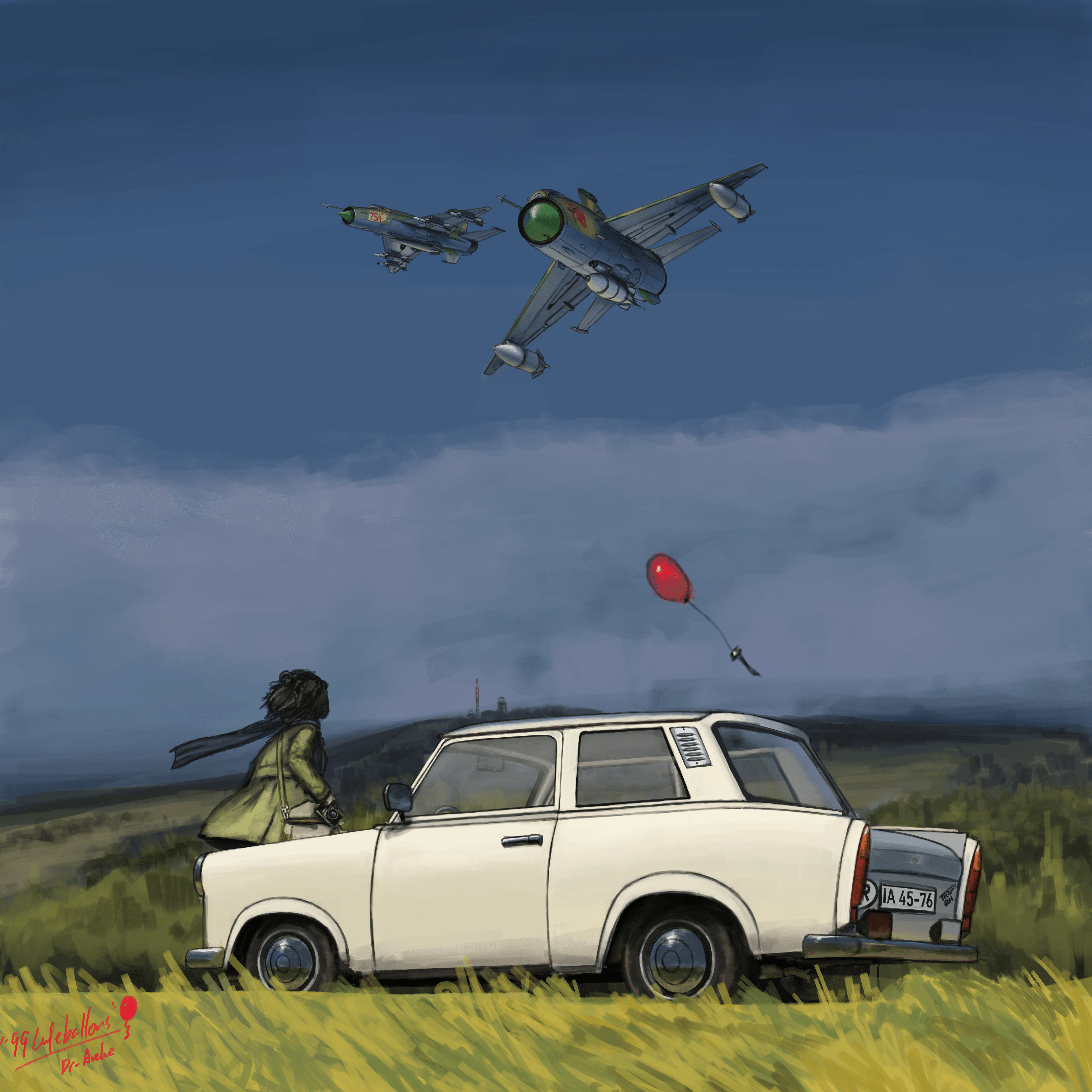 1girl 99_luftballons absurdres air-to-air_missile aircraft airplane bag balloon black_scarf blue_sky bomb brown_bag brown_hair brown_jacket building camera car chinese_commentary cloud cold_war commentary day dr-arche explosive fighter_jet floating_scarf flying from_behind grass handbag highres hill holding holding_camera jacket k-13_vympel license_plate looking_up mig-21 military_vehicle mixed-language_commentary motor_vehicle original outdoors scarf signature sky solo trabant white_car