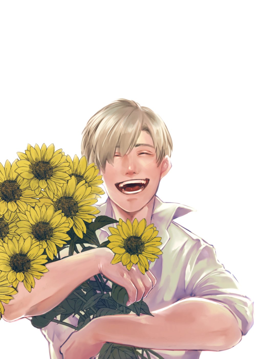 1boy blonde_hair bouquet closed_eyes collared_shirt commentary_request flower grin highres holding holding_bouquet leon_s._kennedy male_focus muscular muscular_male ncle_69 resident_evil shirt short_hair sleeves_rolled_up smile solo sunflower upper_body white_shirt
