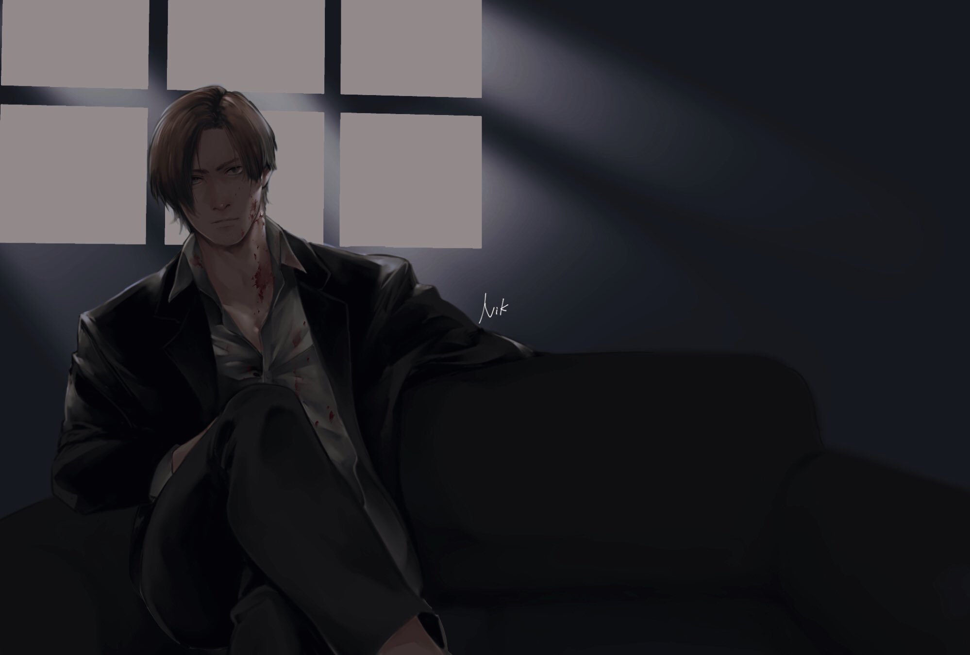 1boy backlighting black_jacket blonde_hair blood blood_on_clothes blood_on_face blood_on_neck blue_eyes collared_shirt commentary_request copyright_request crossed_legs elbow_rest facing_viewer hand_on_own_knee head_tilt highres jacket leon_s._kennedy looking_at_viewer male_focus ncle_69 resident_evil serious shirt short_hair solo white_shirt window_light