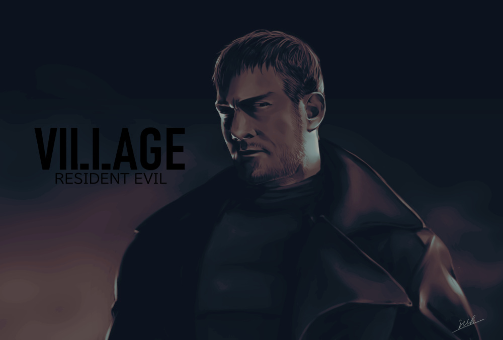 1boy beard_stubble chris_redfield commentary_request copyright_name dark facial_hair furrowed_brow glaring high_collar jacket looking_at_viewer male_focus ncle_69 open_clothes open_jacket popped_collar resident_evil resident_evil_village serious shirt short_hair solo stubble upper_body