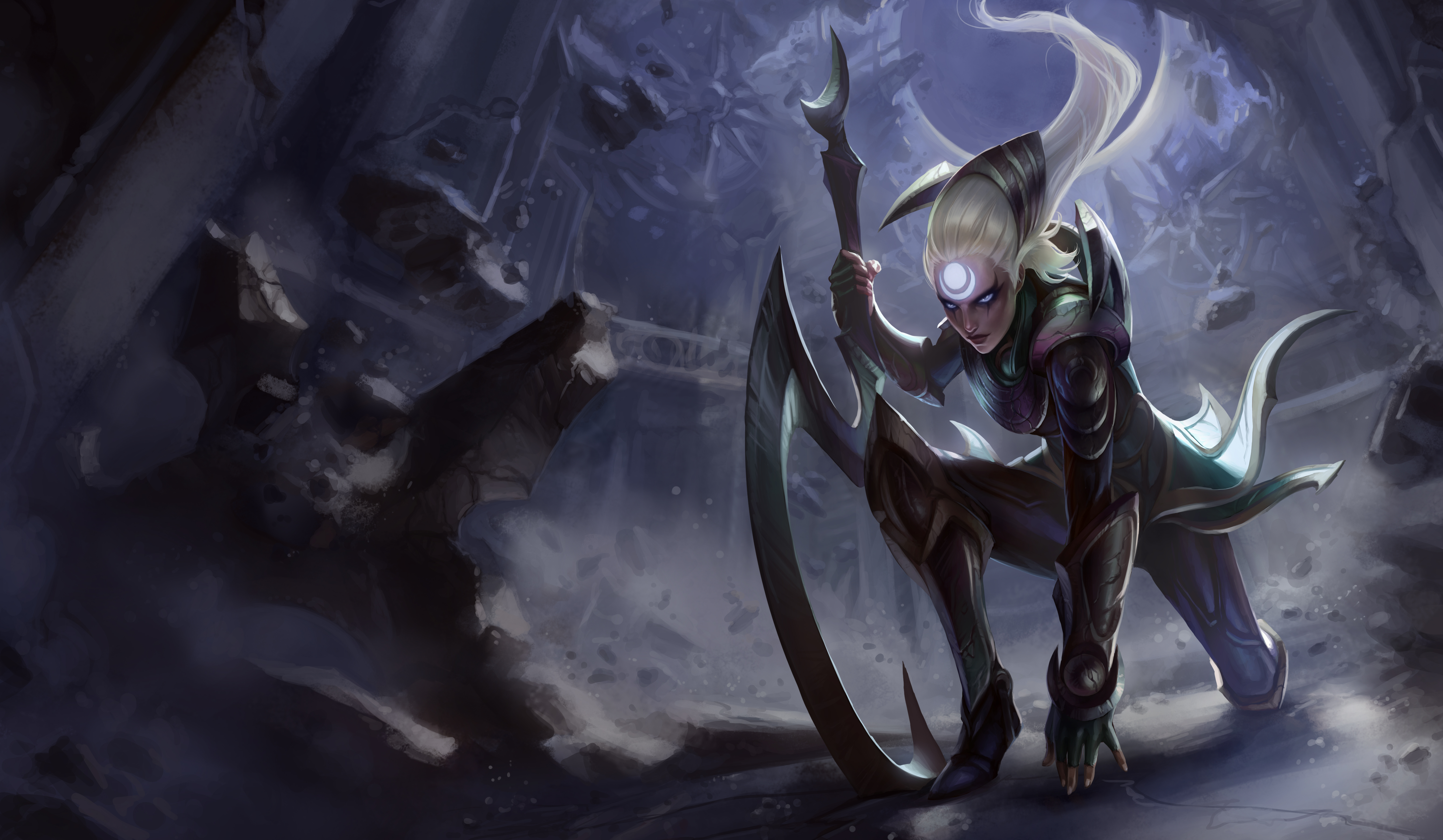 1girl absurdres armor breastplate closed_mouth commentary_request cuisses debris destruction diana_(league_of_legends) facial_mark fingerless_gloves forehead_mark full_moon gloves glowing glowing_eyes greaves grey_eyes highres holding holding_weapon kienan_lafferty league_of_legends leaning_on_object leaning_on_weapon light_particles long_hair moon official_art on_one_knee pauldrons poleyn shoulder_armor solo third-party_source vambraces weapon white_hair white_nails