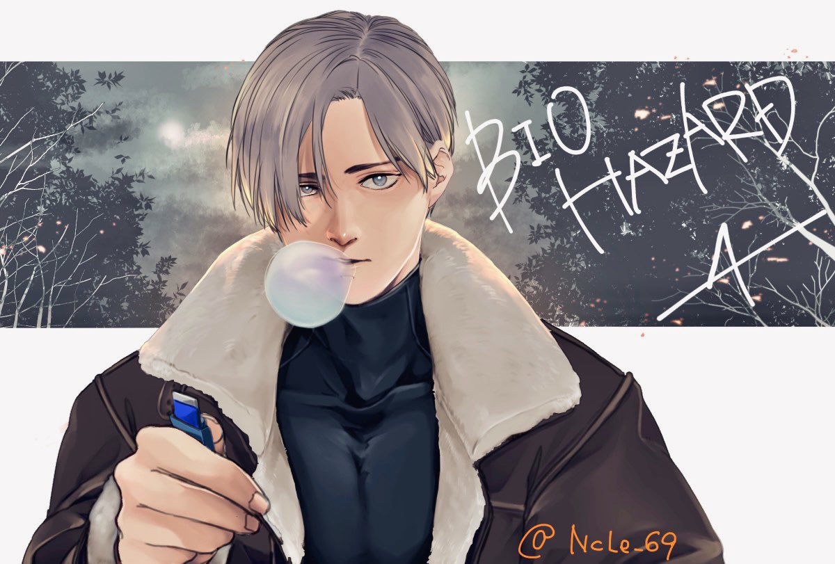 1boy black_shirt blonde_hair blowing_bubble_gum blue_eyes brown_jacket chewing_gum commentary_request copyright_name fur_collar high_collar holding jacket leon_s._kennedy letterboxed looking_at_viewer male_focus ncle_69 outside_border parted_lips resident_evil resident_evil_7:_biohazard shirt short_hair solo