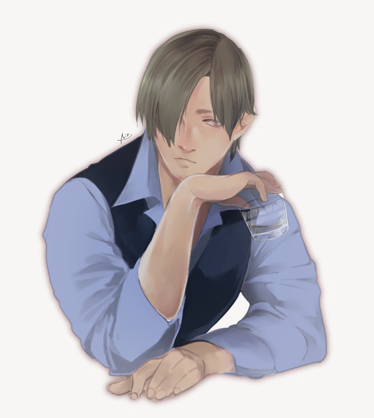 1boy black_vest blonde_hair blue_eyes blue_shirt collared_shirt commentary elbow_rest expressionless hand_on_own_chin highres leon_s._kennedy long_sleeves looking_to_the_side male_focus ncle_69 resident_evil shirt short_hair solo vest