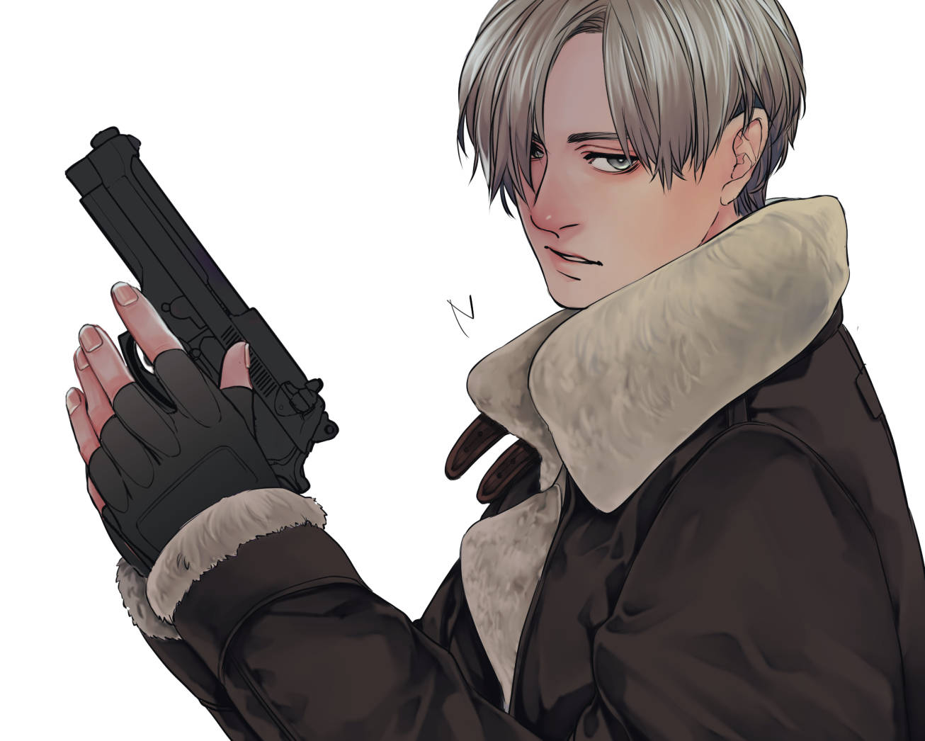 1boy black_gloves blonde_hair blue_eyes brown_jacket commentary_request fingerless_gloves from_side fur_collar gloves gun handgun holding holding_gun holding_weapon jacket leon_s._kennedy looking_at_viewer male_focus ncle_69 parted_lips resident_evil resident_evil_4 short_hair solo weapon