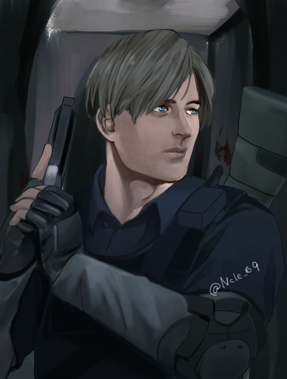 1boy black_gloves blonde_hair blue_eyes blue_shirt collared_shirt commentary_request elbow_pads fingerless_gloves gloves gun handgun hands_up highres holding holding_gun holding_weapon leon_s._kennedy looking_to_the_side male_focus ncle_69 resident_evil serious shirt short_hair solo upper_body weapon