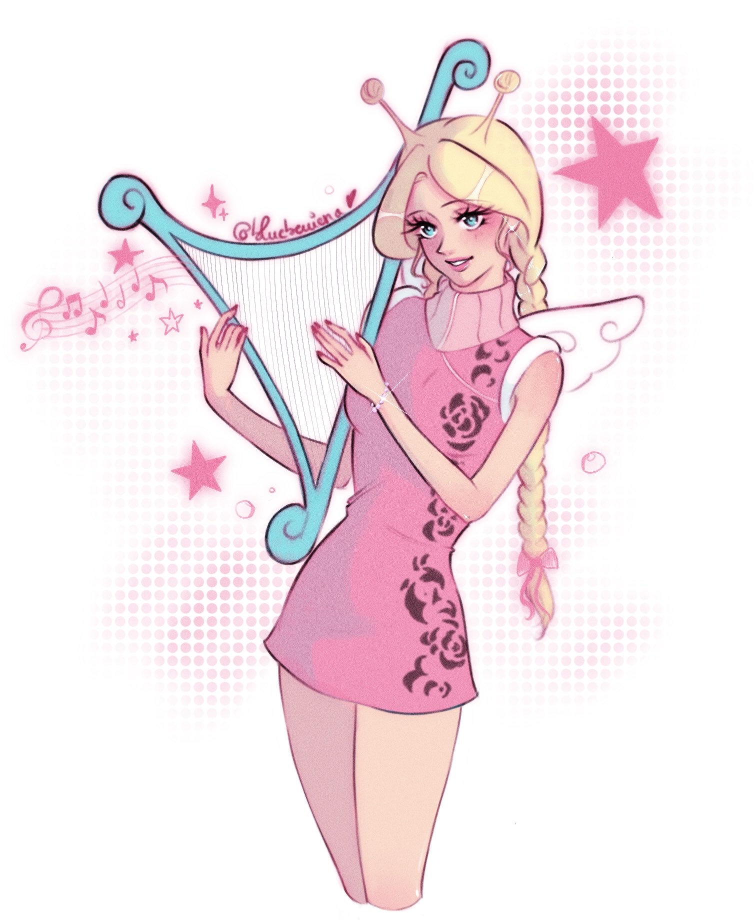 1girl antenna_hair blonde_hair blue_eyes blueberriena braid braided_twintails commentary conis_(one_piece) cropped_legs dress eyelashes highres holding holding_instrument instrument long_eyelashes one_piece pink_dress sleeveless sleeveless_dress smile solo star_(symbol) turtleneck turtleneck_dress white_wings wings
