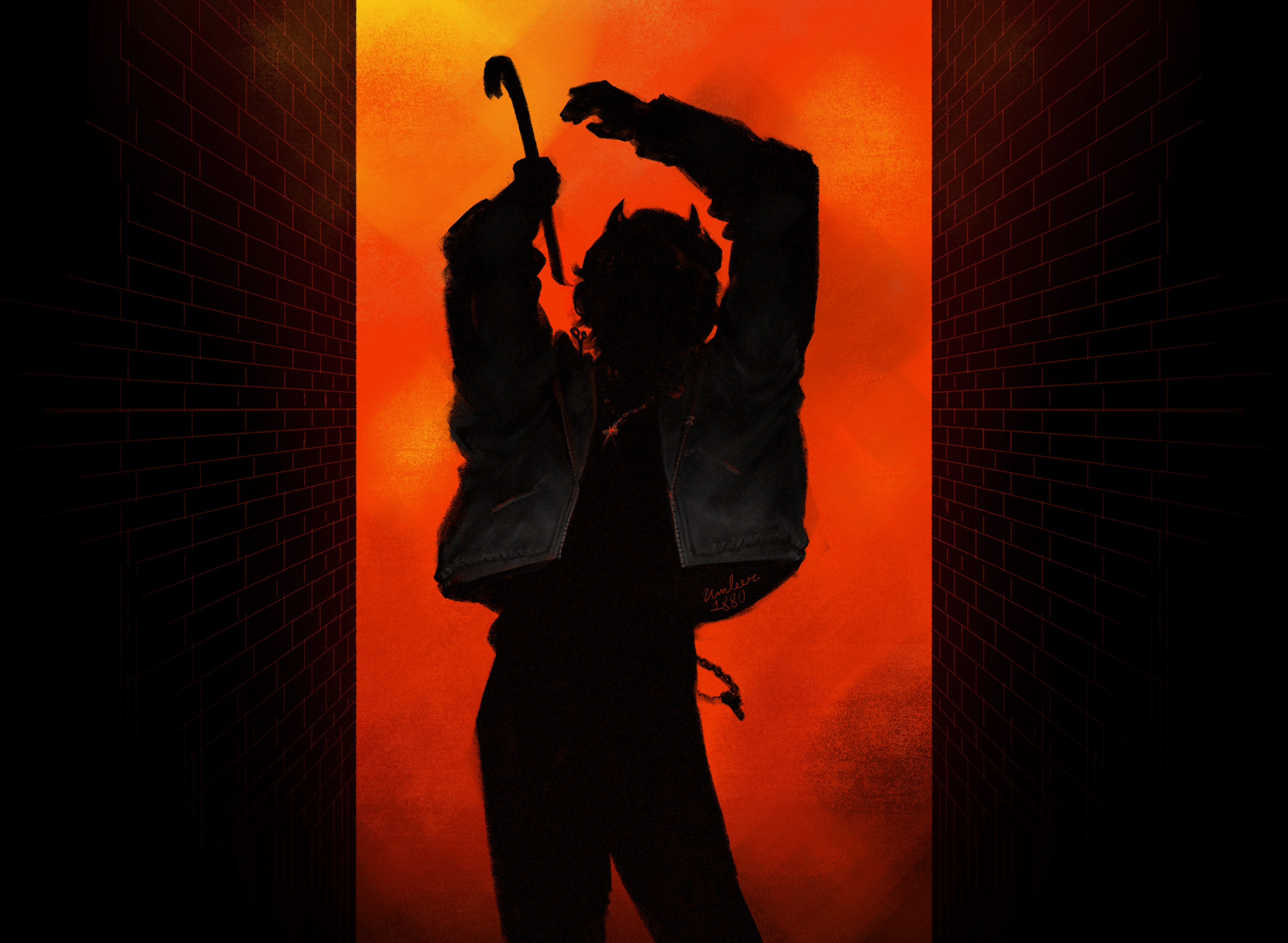 1boy absurdres alley backlighting crowbar dark dark_alleyway demon_horns demon_tail faceless facing_viewer hands_up highres holding holding_crowbar horns horror_(theme) incoming_attack jacket jewelry killer_chat! necklace orange_theme ronin_(killer_chat) tail umber1880