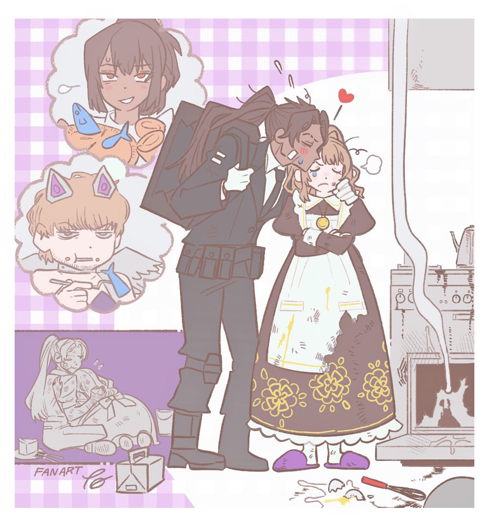 2boys 2girls apron black_boots black_pants blush boots brown_hair burning catherine_(project_moon) closed_eyes closed_mouth commentary_request cosplay crossed_arms food full-stop_office_(identity)_(project_moon) heathcliff_(project_moon) hetero hindley_(project_moon) jewelry juliet_sleeves kiss kitchen limbus_company long_sleeves meow_(project_moon) meow_(project_moon)_(cosplay) multiple_boys multiple_girls necklace nelly_(project_moon) orange_eyes oven pants partially_cracked_egg pie project_moon puffy_sleeves purple_slippers slippers stargazy_pie tama_launcher whisk white_apron