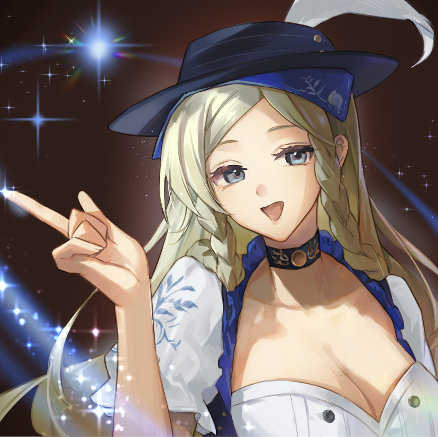 1girl :d black_choker black_hat blonde_hair blue_eyes braid braided_sidelocks breasts brown_background choker cleavage commentary_request hand_up hat hat_feather index_finger_raised large_breasts long_hair looking_at_viewer ms._moissan open_mouth porkpie_hat puffy_short_sleeves puffy_sleeves reverse:1999 shirt short_sleeves sidelocks smile solo sparkle susii upper_body white_shirt