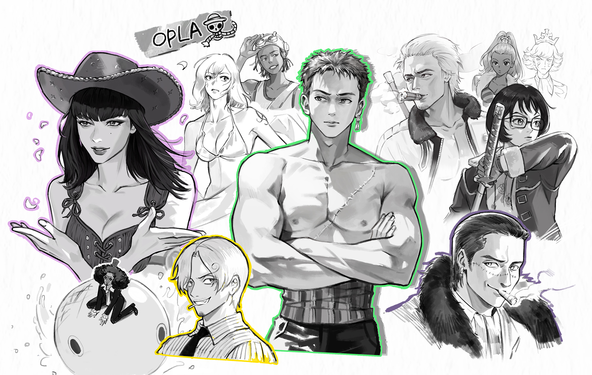 2026 4girls 6+boys afro arm_tattoo bikini blunt_bangs brook_(one_piece) cigar commentary cowboy_hat crocodile_(one_piece) crossed_arms crown dadario earrings glasses gloves greyscale haramaki hat highres holding holding_sword holding_weapon jewelry laboon long_hair looking_to_the_side mister_nine_(one_piece) mole monochrome multiple_boys multiple_girls nami_(one_piece) nefertari_vivi nico_robin nico_robin_(whisky_peak) one_piece one_piece_(live_action) ponytail roronoa_zoro sanji_(one_piece) scar scar_on_chest short_hair smile smoke smoker_(one_piece) stitched_face stitched_torso stitches swimsuit sword tashigi tattoo topless_male usopp weapon whale