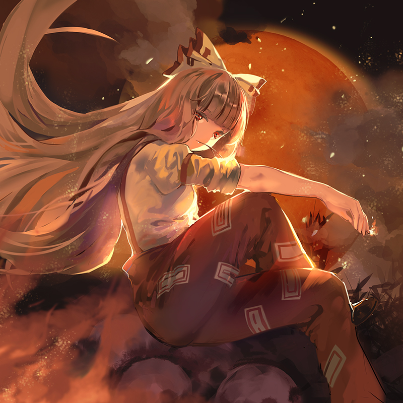 &{ID:13714602 CreatedAt:Mon Mar 23 18:45:35 -0500 2026 Score:2 Width:800 Height:800 MD5:4d53815c30d71aebfc5752de42e6510b Directory:4d/53 Image:4d53815c30d71aebfc5752de42e6510b.jpg Rating:general Source:https://tsubakinapoleon.booth.pm/items/1360418 Change:1774309535 Owner:danbooru CreatorID:6498 ParentID:0 Sample:0 PreviewHeight:350 PreviewWidth:350 Tags:1girl bow burning colored_eyelashes commentary_request fire foot_out_of_frame from_side fujiwara_no_mokou full_moon grey_hair hair_bow kita_(kitairoha) knee_up long_hair looking_at_viewer looking_to_the_side moon mouth_hold ofuda ofuda_on_clothes pants red_eyes red_moon red_pants red_theme second-party_source short_sleeves sitting smoke solo sparks stalk_in_mouth suspenders touhou translation_request white_bow Title: HasNotes:false HasComments:false FileURL:https://img2.gelbooru.com/images/4d/53/4d53815c30d71aebfc5752de42e6510b.jpg PreviewURL:https://gelbooru.com/thumbnails/4d/53/thumbnail_4d53815c30d71aebfc5752de42e6510b.jpg SampleURL: SampleHeight:0 SampleWidth:0 Status:active PostLocked:0 HasChildren:false IsVideo:false DisplayDate:23.03.2026 18:45}